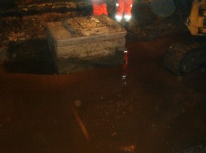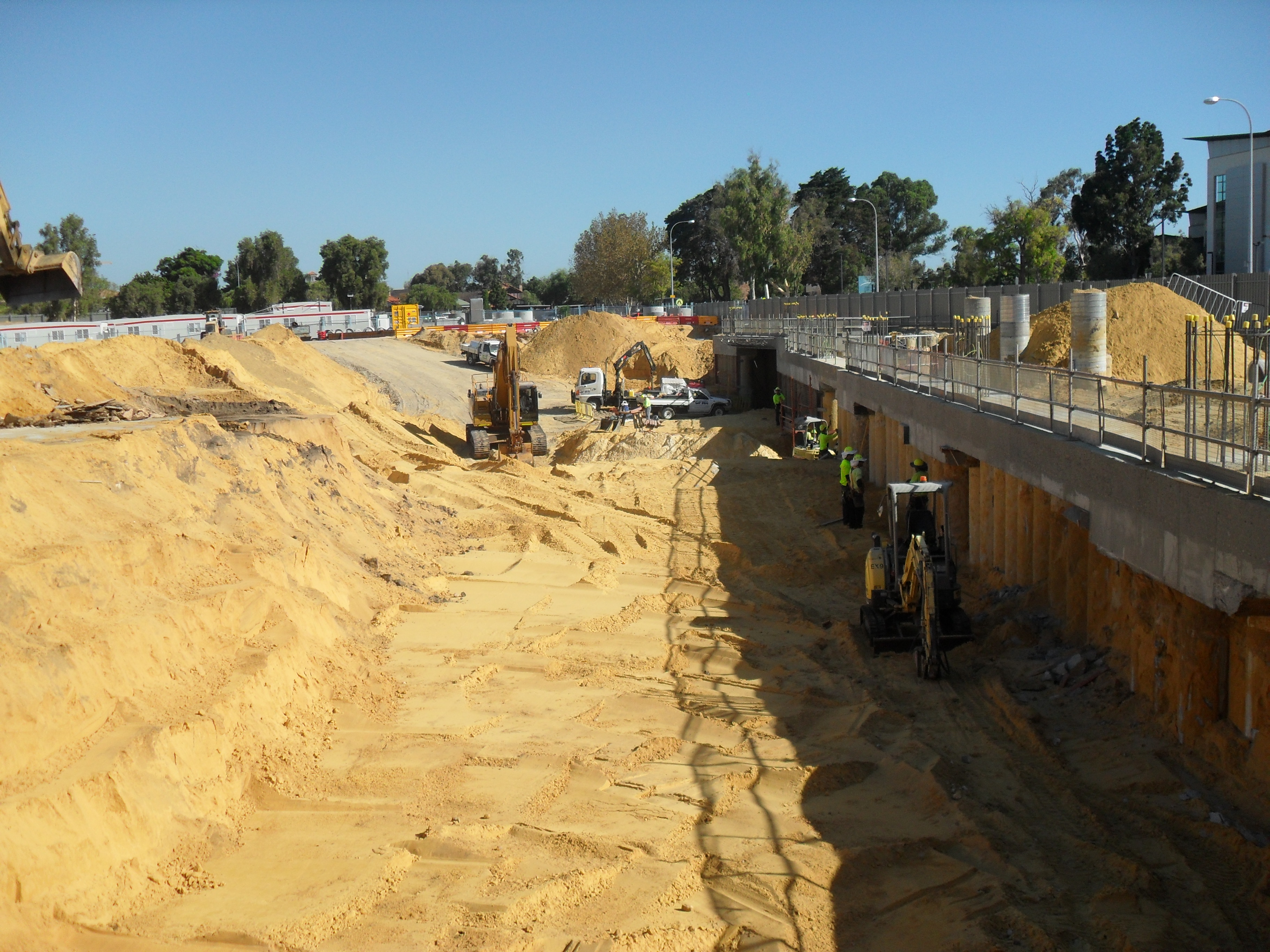 4. Oh Shit we hit something. Initially on site there were many services crisscrossing site and these have mostly been removed with a plan to remove the final few in the next 10 days. On Friday however whilst excavating the service tunnel a 150mm water pipe was struck and water released onto site. Emergency plumbing works will finish the diversion of this sewer over the weekend and the site was lucky as the water was “clean” (cooling tower condensation water) and will easily disperse in the Sand. Of more of a concern is that there is a High Pressure Gas main in the north of the site which we are still waiting permission from state to relocate….lets hope we don’t hit this!!