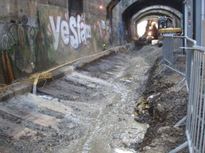 Clearly no works on this project would be complete without water, and the re-profiling does not disappoint. As a result of excavating concrete away from the existing concrete retaining walls, the surface area for seepage has been increased, and the flow path, permeability (due to removal of a relatively sealed surface) and opposing pressure from the slab has been reduced, hence the volume of water flowing onto the re-profiled slab has increased significantly. The presence of water on the slab makes re-profiling more difficult, and a temporary pump is being used to clear the surface of water until a temporary sump and drainage system is installed in the single tunnels, at the end of the re-profiling section.