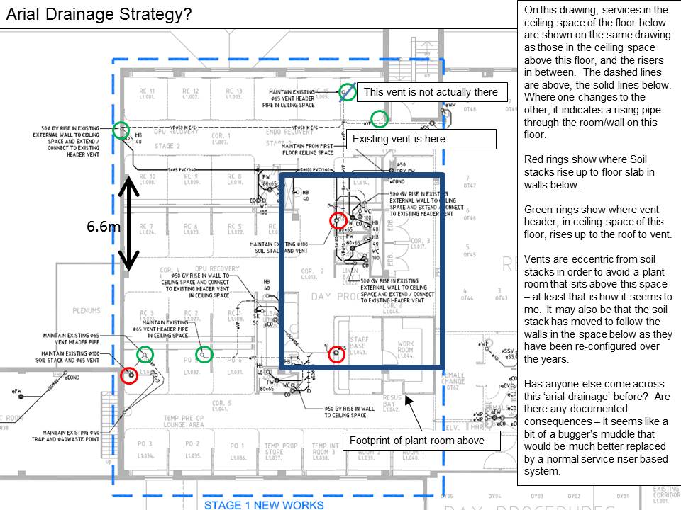 The job I am working on is a little unusual, in that there is no services riser. The section of the hospital that we are currently re-fitting was originally built as a single story, and then converted to a double, then a triple storey affair. Things seem almost to have been piled up on top of each other as the various re-fits and expansions have taken place over the years – even the structural columns have moved around (Mark, this probably answers your earlier question about the location of the med gas isolation valves – As is happening with this referb, they seem to be thrown in wherever they are needed to allow the next extension to be built). Here is a drawing of the new drainage system in my referb area, with my annotations of where the soil stacks are located on the floor below. The stacks and vents are linked by a vent header system in the ceiling above the floor shown.