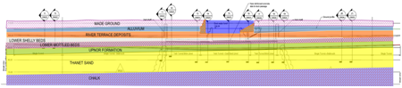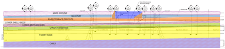 Fortunately for both Bachy and Vinci (who are also liable for delay damages to Crossrail), it has transpired that the geological assumptions were not wholly reflective of the in-situ conditions. All the holes drilled in the West Single and Twin Tunnel showed there to be varying degrees of Made Ground between the tunnel structure and the natural ground (all of which was clay derived), and also proved that at the level of drilling, the adjacent strata was Lambeth Group, and not as anticipated, River Terrace Deposits.