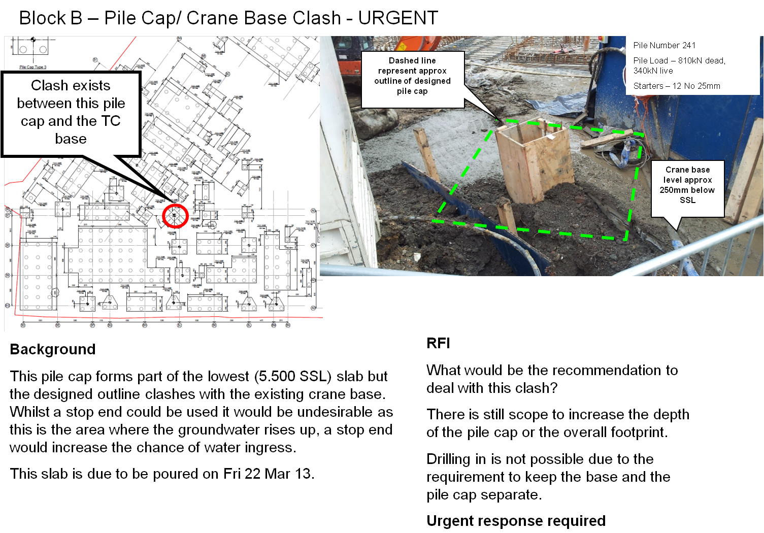 - Crane Base and Pile Cap. The crane base for my block sits just below the finished slab level of the basement, inside the basement itself but outside of the final structural walls. Somewhere along the line, either in design or tolerances during construction the base was constructed very close to one of the structural piles and overlapped quite severely with the pile cap as designed. Due to the artesian water conditions on the site we wish to minimise the number of joints in the concrete and therefore wished to include the pile cap in question. I was brought to my attention by the sub-contractor’s foreman. The design engineers have been somewhat overwhelmed with RFIs on this job and as such a response is not guaranteed in a timely fashion, I decided on a new approach. The world of construction doesn’t seem to have seen a quad slide before, it works. The response was received in good time to implement the solution although in the end time simply got the better of the pour and that particular slab pour didn’t include that pile cap.