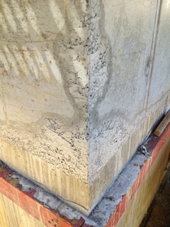 The pour appeared to go well from my amateur perspective, but after the shuttering was removed it looks pretty poor. There are a couple of small areas where the concrete hasn’t quite reached on the underside of voids and a couple of corners that appear to have honeycombed somewhat (potentially a leak in the formwork).