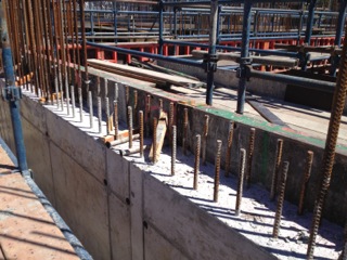 I am now looking at column and wall pours in the South Block from the upper car park level to ground level. In an attempt to make up some time it was suggested that the columns and ramp walls should be poured as one unit. I agree that this would save time in pouring, but after the issues with reinforcement fixing that I experienced with Riser 1, think that the additional effort of getting the whole thing formed and fixed could take longer than expected. The other option is to use couplers embedded into the columns and pour a more simple, un-structural flat wall at a later date. I will be looking into this next week.