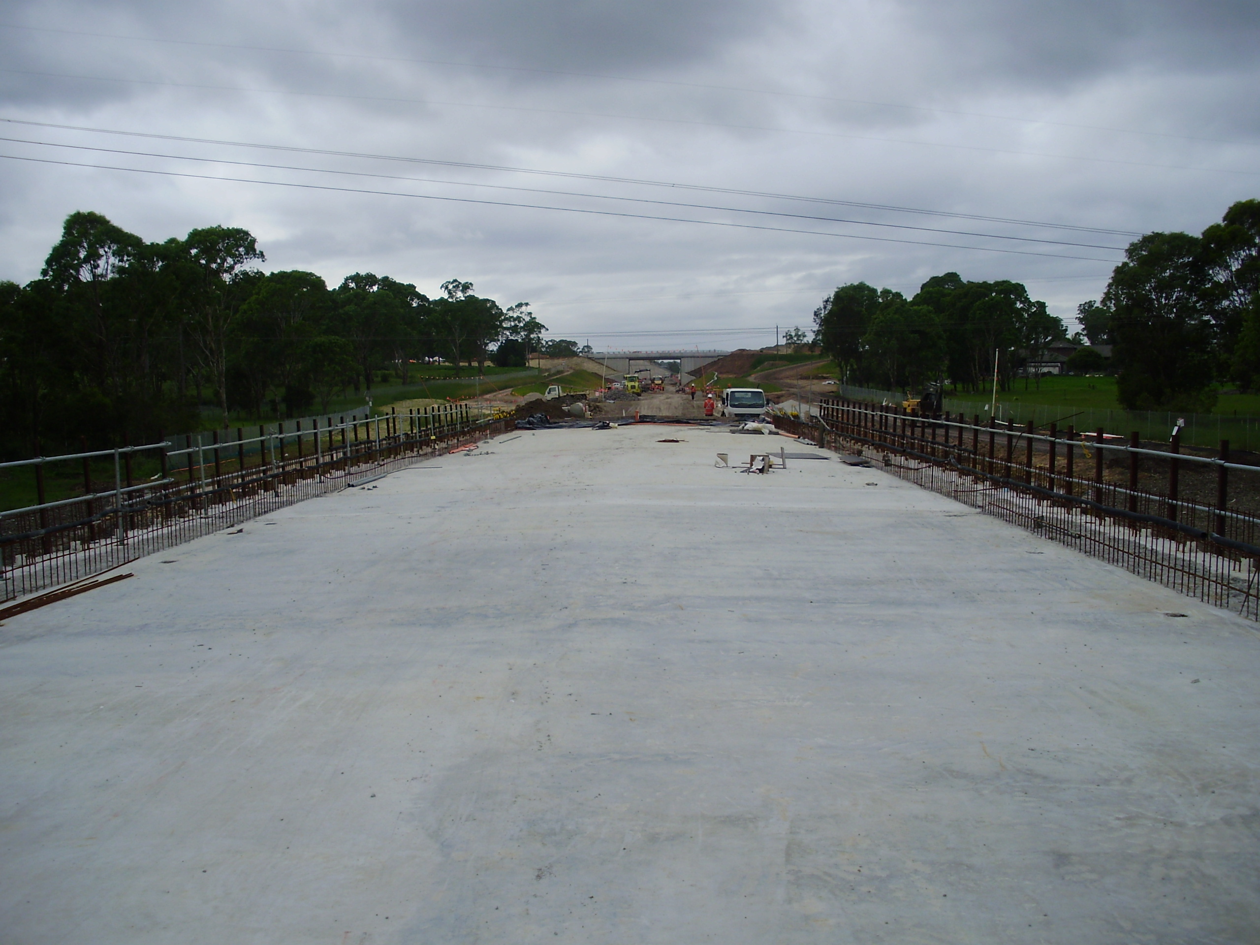 Having spent most of my time last week getting stuck into the 47 drawings of Dickson Rd Overbridge I Have no switched my attention to another bridge. Kemps Creek bridge is an Underbridge which is the last structure that takes the rail line into the stabling yard. It is a 72m span which is about 80% complete but has sat idle for about 2 months as what I understand to be a ‘spartacus’ bicker occured as to who had the priority. The stabling yard won and so it is now time to crack on and complete the bridge by constructing the parapit walls. This is a view looking from the stabling yard end towards Glenfield with Eastwood Rd Overbridge in the distance. Both end appraoch slabs were cast on Thu and we ended up pouring to about 1755 where all works need to be complete by 1800 so we were cutting it fine – looks a little cloundy but it was still 25 oC. There are 46 precast parapit sections each weighing about 5T to be placed on the edges using angle brackets which bolt into the deck. Once these sections are secured then the walk ways will be poured which will cover the anchor brackets and tie in the parapit sections to the bridge deck. This has also been done on Eastwwod Rd bridge but as the brackets are effectively only temporary they didn’t seem to be strong enough, when the crash barriers were poured we had about 20mm movement on one section due to the weight of the concrete so that the bolts for the traffic barrier railing are now out of alignment.