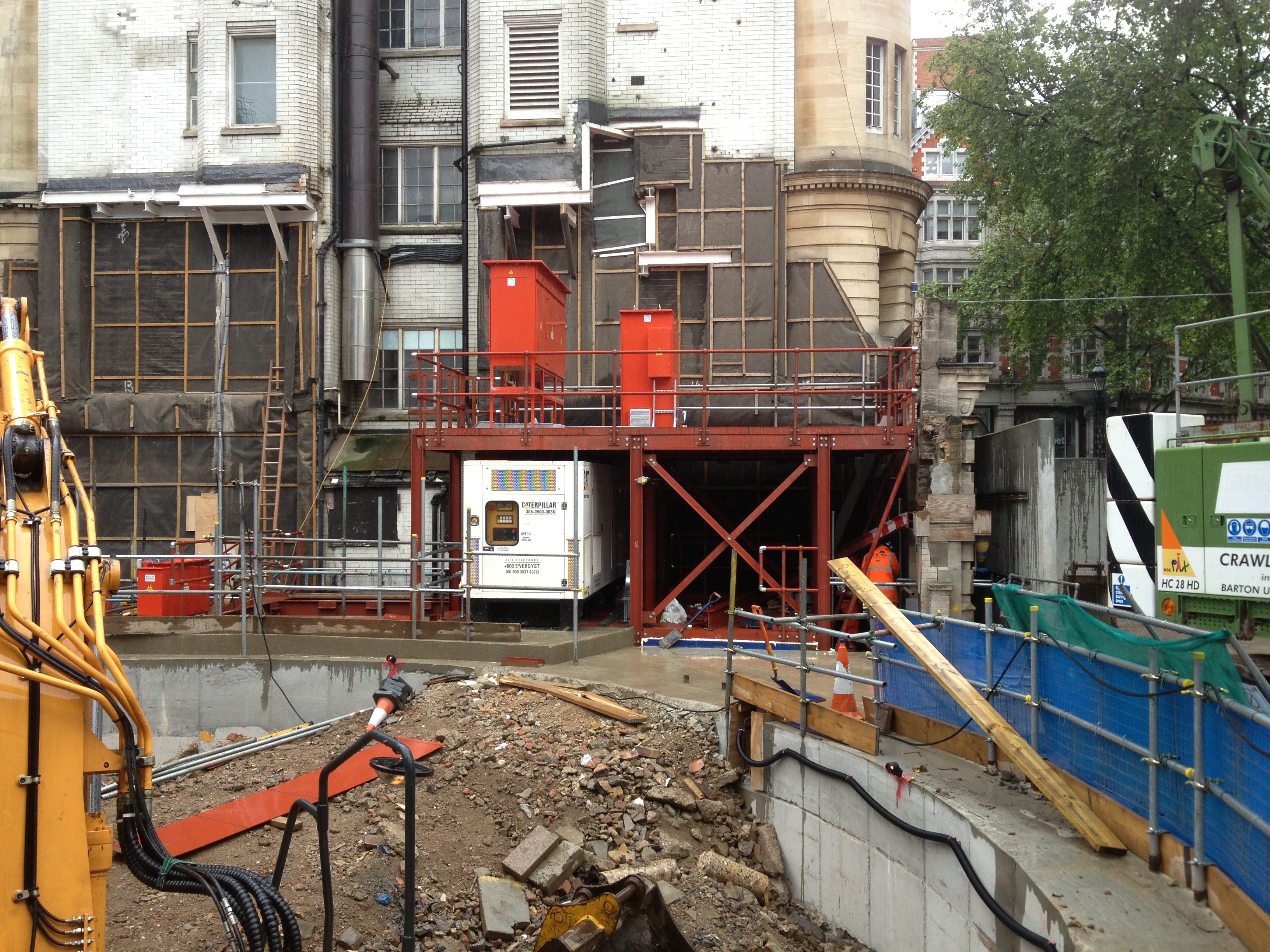 The Muckbin has also been completed this week, including the propping of the sub basements in both our building and the adjacent buildings. The only issue now is some debris netting to be put in place in order to protect the public footpath and our building, as it’s a listed building. The Muckbin will be accommodating the 200m3 of soil that will be obtained from each 1m depth of shaft excavation. My only concern now is that the Muck skip or the excavator will knock into the building and stop works for a considerable amount of time. I have had a designer produce a scaffolding barrier that would protect the building, however the powers to be have decided against it. We shall see who is right in the weeks to come.
