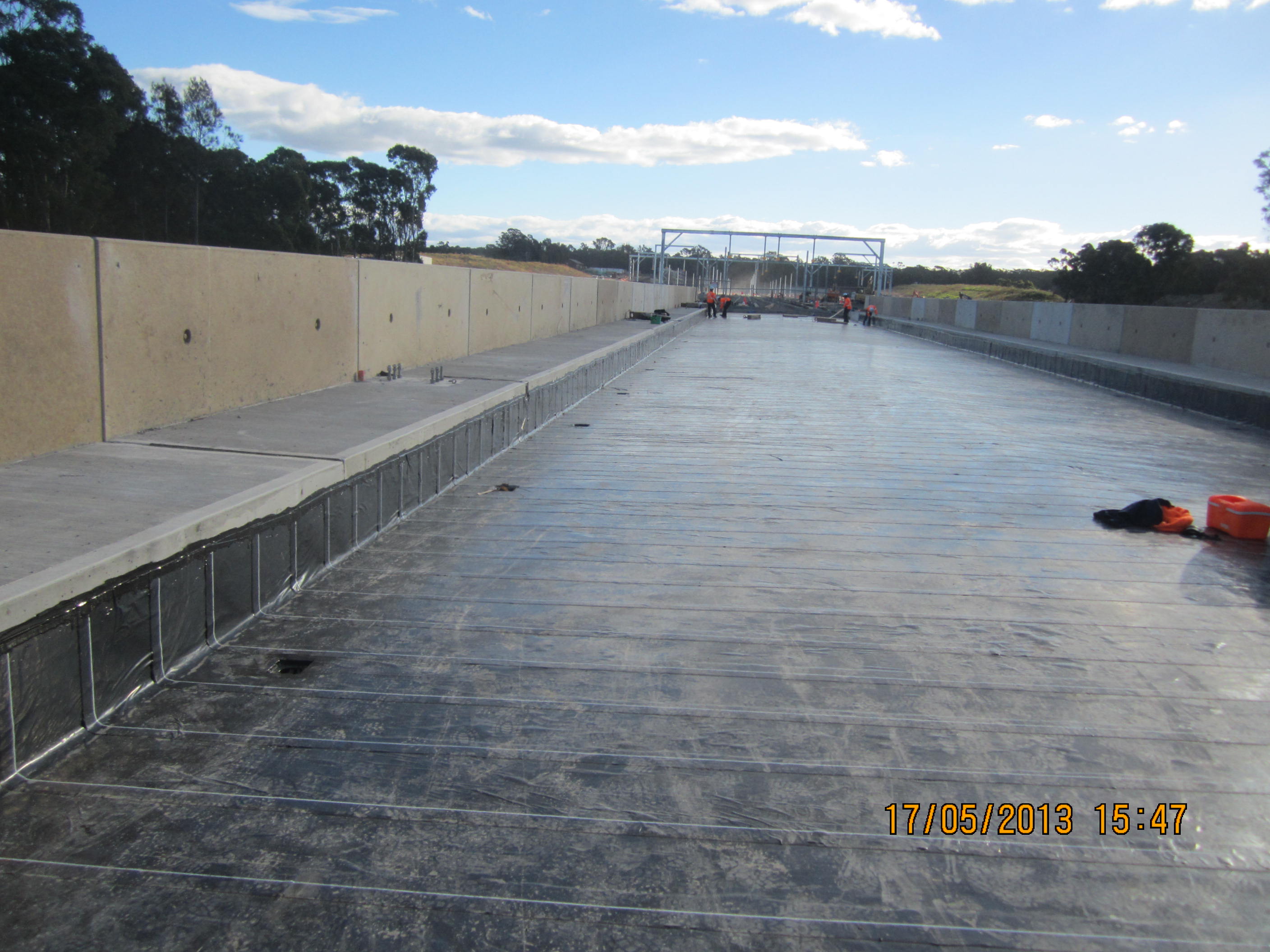 Kemps Creek bridge has now been cleaned up at waterproofed. Next week will see shock matting laid over the waterproofing which provides a bed for the bottom balast to be laid on which will also start next week. We still have a few bays of CSR walkway to pour at abutment A after placing the last remaining parapet sections which we should/need to complete by wed before the handover. We are handing over the site to the rail line but we still have few minor jobs to do but these consisit of access walkways below the bridge around the abutments and piers and access stairways.