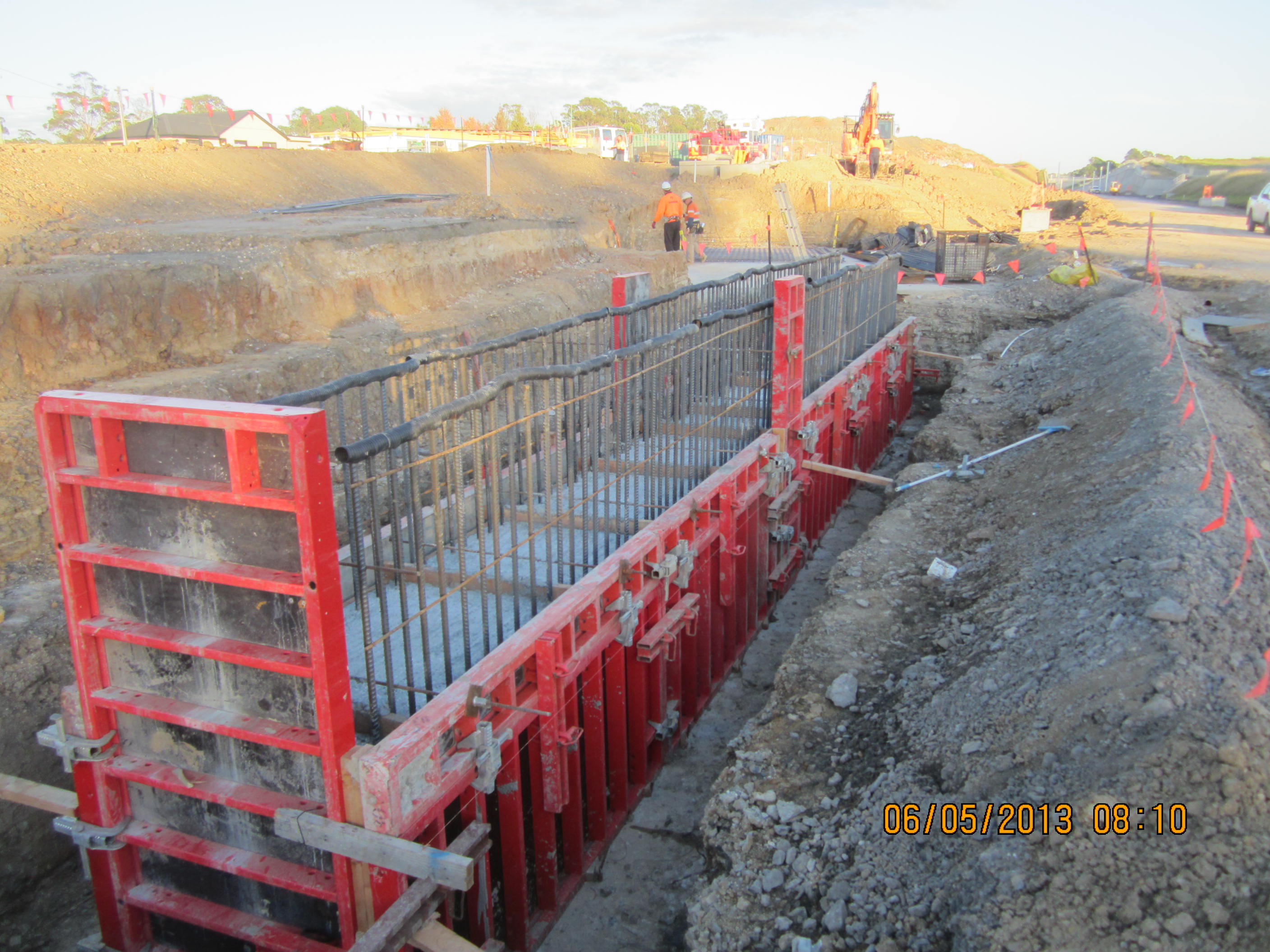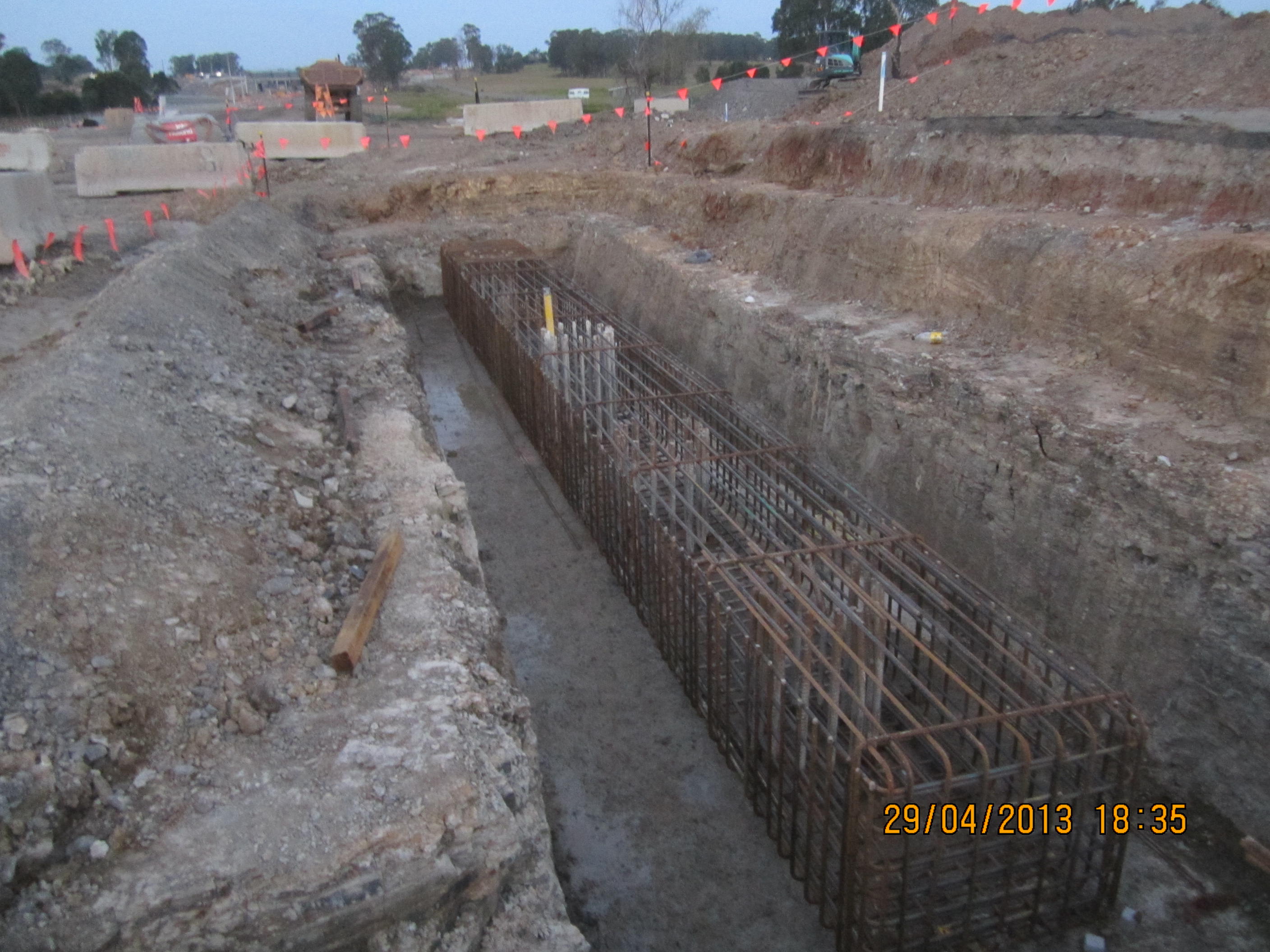 As last week included ANZAC day (thu) and yet another Rostered Day Off for all onsite trades on the fri, actual production has been very slow. So this post covers a week and half as we continue to try and get out of the ground at Dickson Rd. We have now excavated and blinded the four Embankment Retaining Walls (deflection walls) which are utilising as laydown areas for the pile cap steel. We have had a few problems in de-watering the pile cap excavations over the past couple of weeks as the shale material has been acting like a conduit to trickle water further down the alignment into what is the lowest point in the vicinity into our holes. The CSR is also not helping in that respect as they currently stop just before the excavations so water literally floods down the services conduits. After acquiring the a de-watering permit to discharge our ‘clean’ water (floculant added overnight) into Scalabrini Creek we got an enviro slap on the wrist when the pump head slipped out of the bucket and started sucking up the snot at the bottom which meant we were pumpng ‘dirty’ water for a while without our knowledge. We then pumped the other pile cap using a ‘sucker truck’ and eptied it into a holding pond a few hundred metres away having seen the civil team do this yesterday. The pond is geofabric lined and is treated regularly before emptied. The pond holds about 500 ‘sucker truck’ loads and we added 1 which again seemed to cause an enviro stir and our second slap on the wrist. Apparently the civil team ‘dobbed’ us in even though we didn’t think we were doing anything wrong. Theye claim that they had ‘flocced’ the pond the previous day ready to be pumped and that we had now dirtied the water. In our defence we asked for permission to pump from the General Superintendent who also seems to be the civil superintenednt as well. We were also told we require a permit to de-water everytime we want to pump and on the permit it has to state exactly where you are pumping to. Overall it has been a slow and frustrating few days but lots learned about enviro and especially the particulars of Erosion and Sediment Control Management.