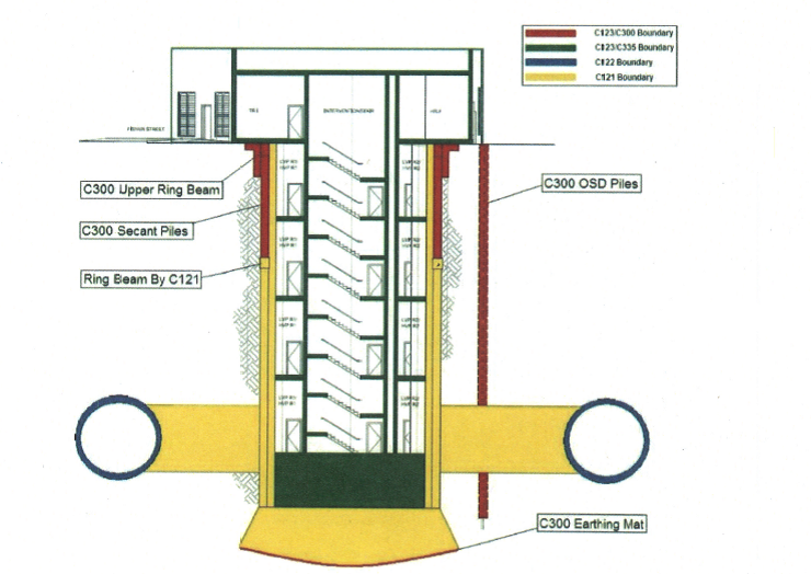 The access shaft is broken down into a number of components. The Secant piles have been designed under the contract C123, by Jacobs. The remainder of the shaft has been designed under the contract C121 by Mott Macdonald. This has caused several issues as there appears to have been very limited communication between the two designers.