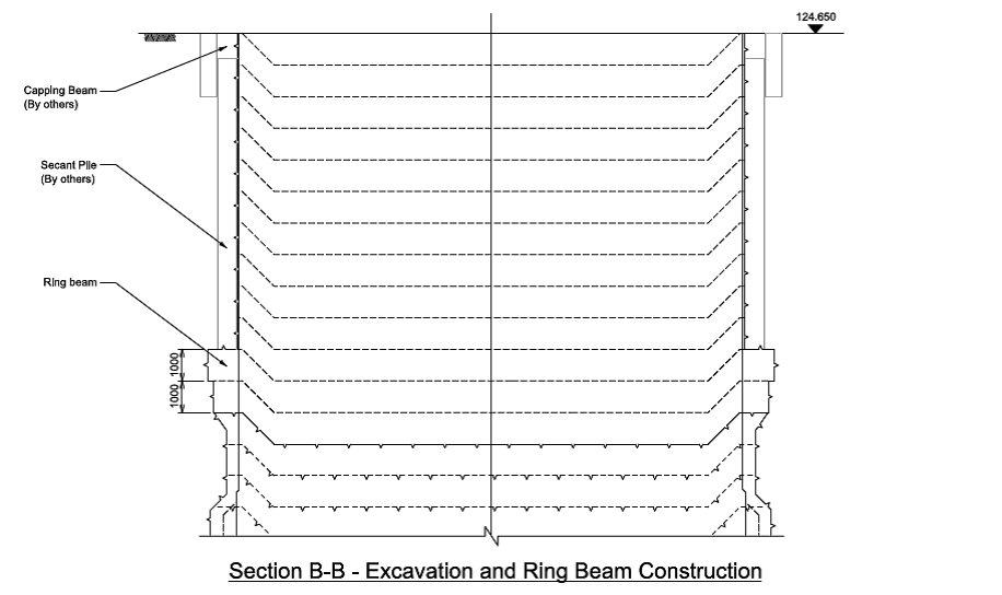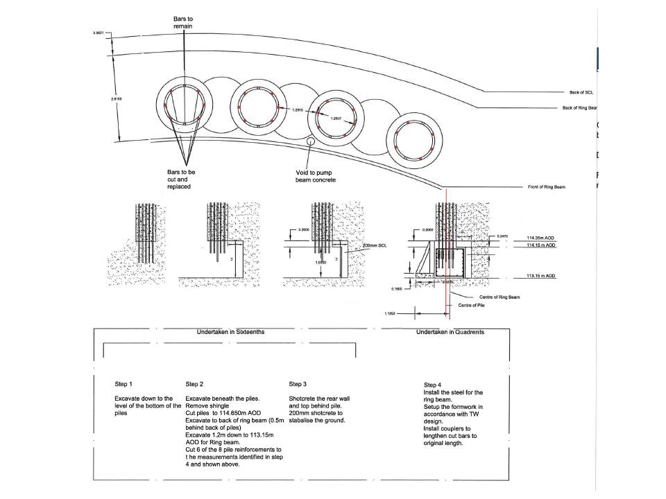 Due to the amount of reinforcement of the piles, the construction sequence of the Ring Beam had to be modified. As you can see from the sequence below, the reinforcement in the piles needed to be cut.