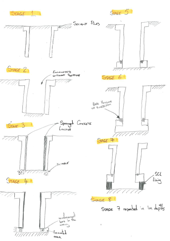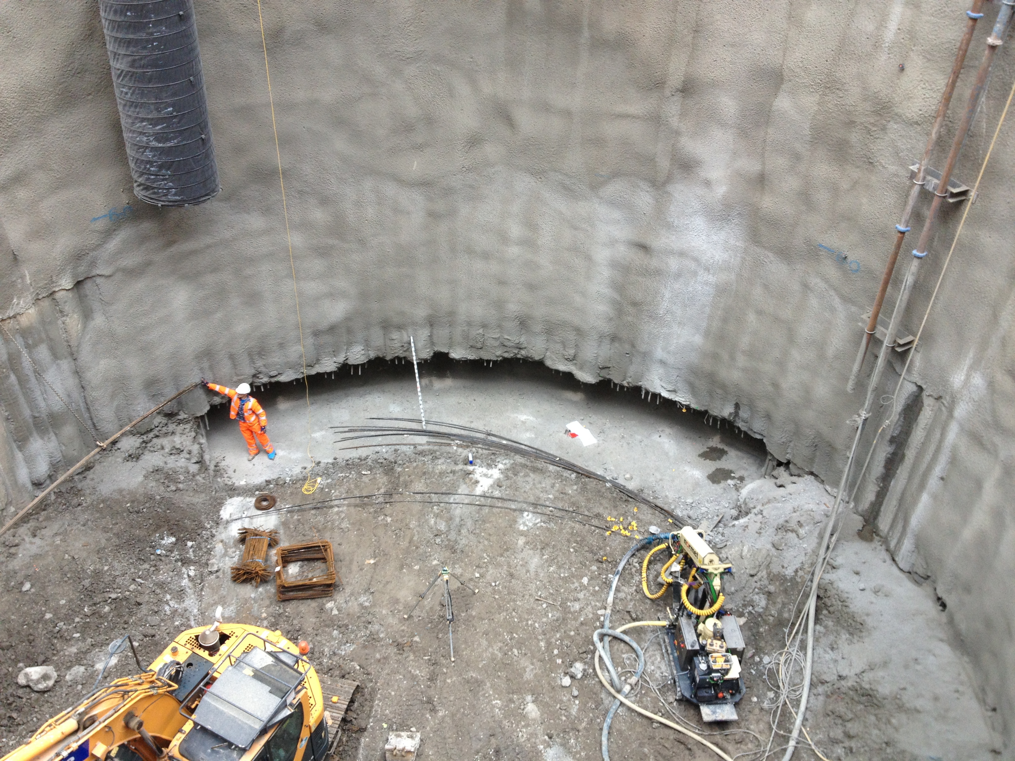 Jacobs insisted that once the Secant piles had been driven into place, propping would be necessary during the excavation phase. Additionally they insisted that the shaft was excavated in quadrants, sprayed with a regulating layer before moving onto the next quadrant.