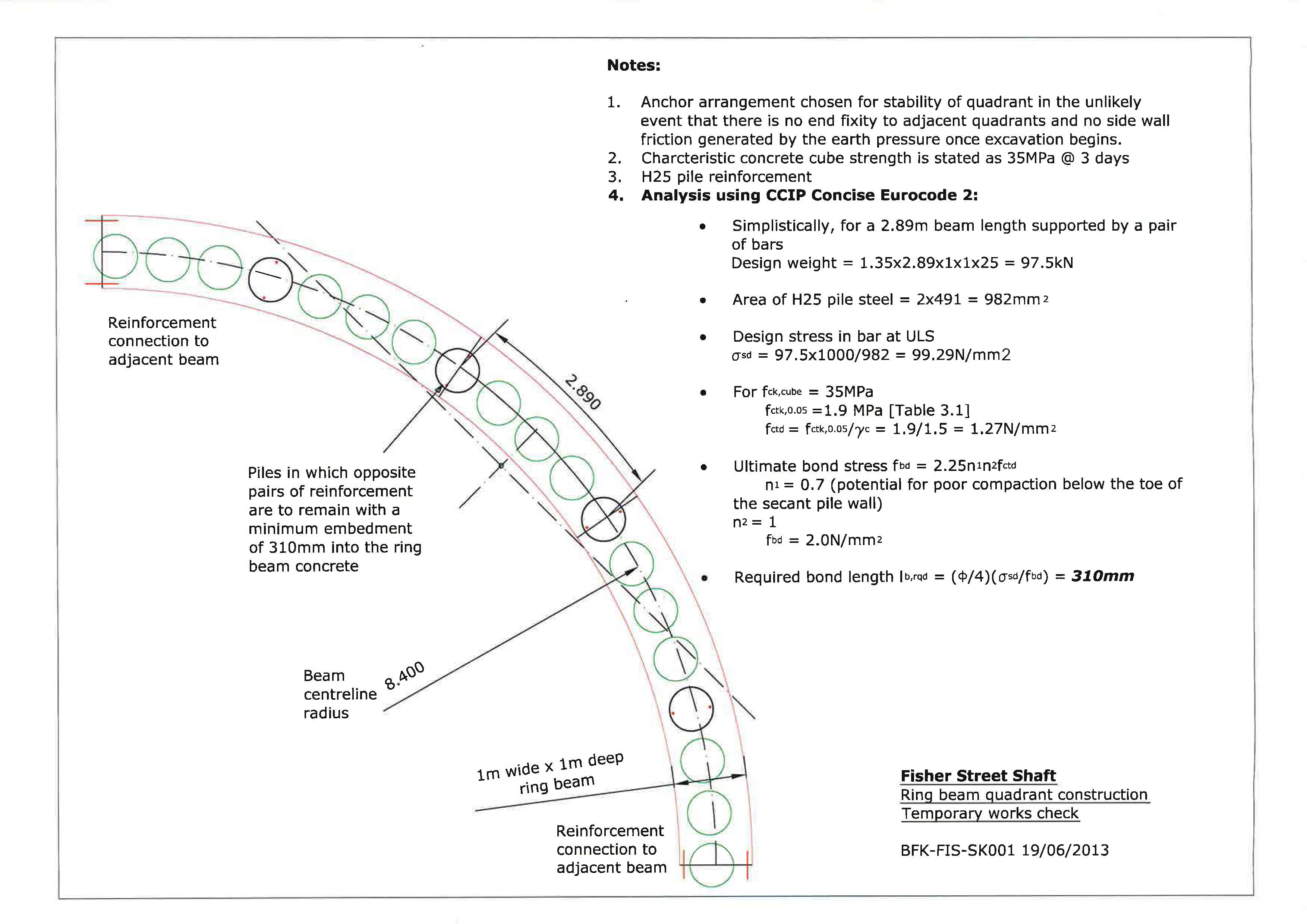 Ok, so the last post took us to the point of trials taking place, in order to ascertain the correct construction method. As a result the number of reinforcement bars, from the piles into the ringbeam reinforcement, was reduced. THe designers conceded that there was only a requirement for 3 x bars/male pile to protrude into the ringbeam. These 3 bars would provide sufficient shear reinforcement and bond length (in order for the next phase of excavation, where the ring beam will be temporarily suspended). The designers did specify that 2 of the bars had to be on the near face and the other on the far face of the shaft.