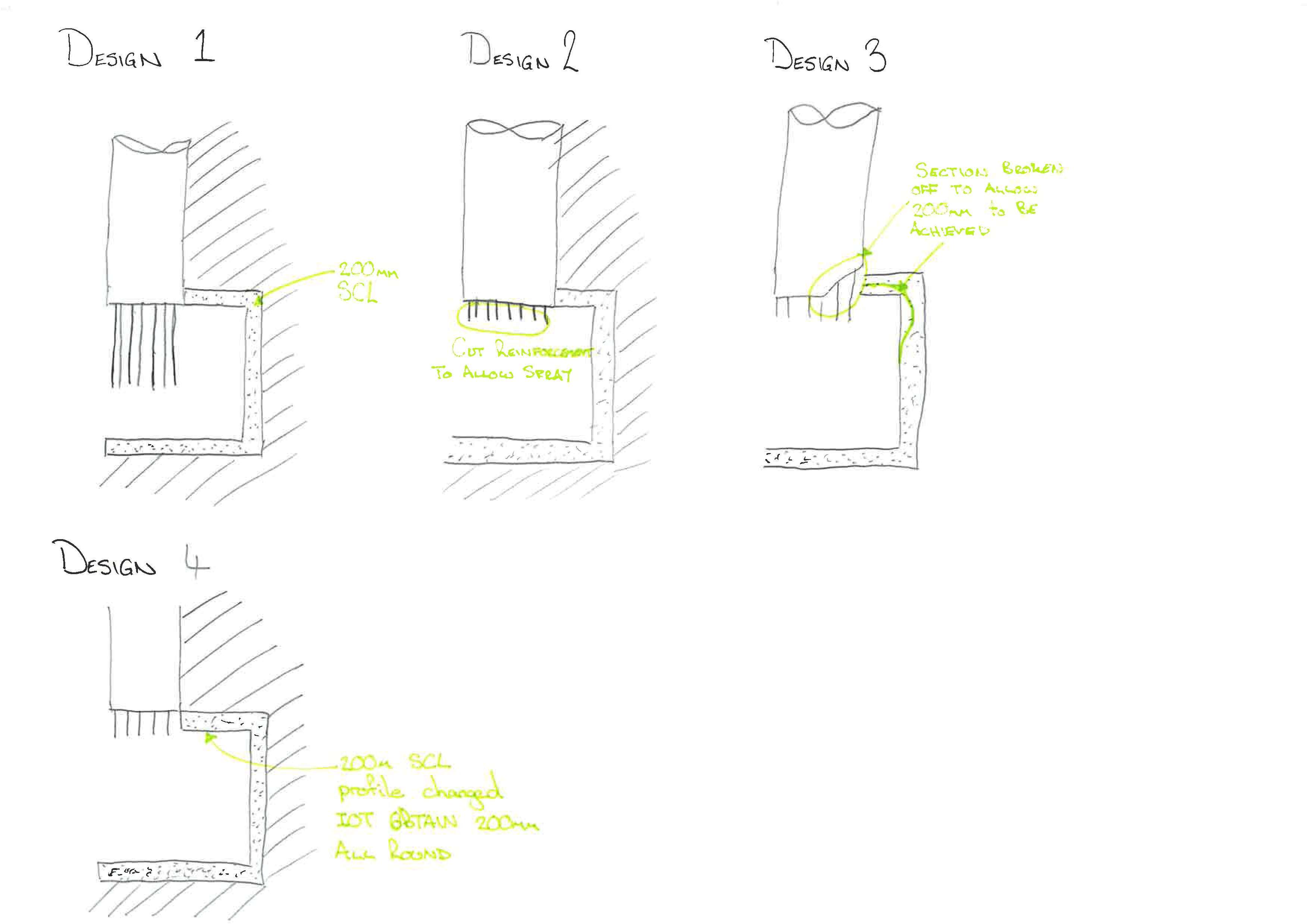The next issue is trying to obtain the 200mm SCL required in the cavity below the piles, where the Ring Beam will sit. There has been several modifications, but it now seems that with design #4 (as seen below) we are managing to get the correct SCL profile.