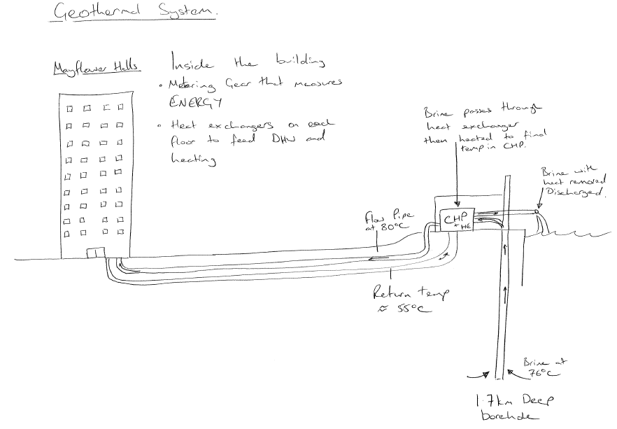 The flow pipe can flow in both directions (not simultaneously for the confused Civils amongst us, I stopped short of asking the stupid question of how that works, instead choosing to nod sagely) depending on demand. So if a sudden demand occurs near the civic centre CHP and pump it will be fed from there and the CHPs and pumps are the other extremes of the network pump water inwards to fill the ‘gap’.