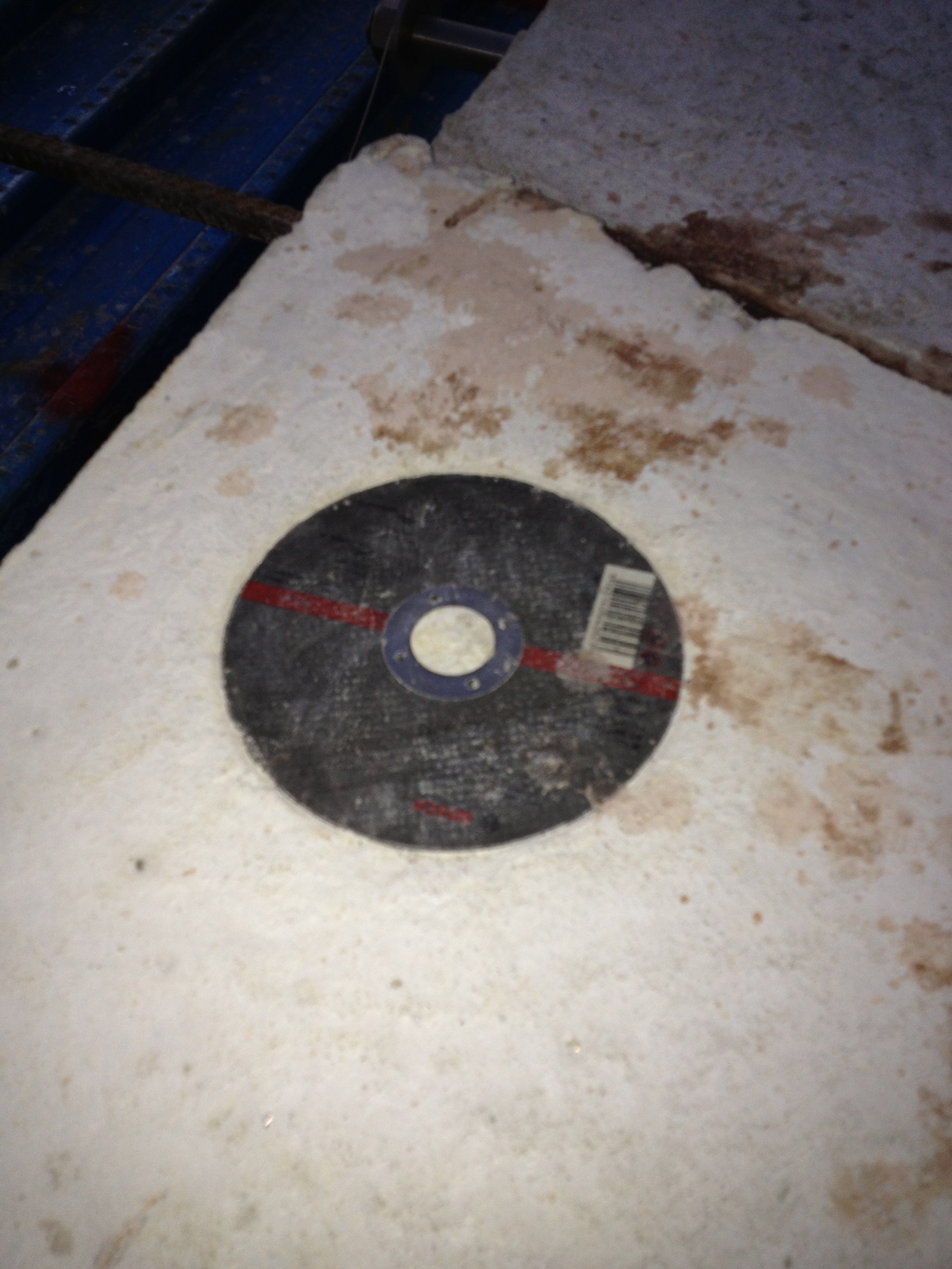 Fig 2, shows where the concrete placement subcontractor has placed a height marker to indicate the ridge line of the top of the slab falls – a good idea, as long as you remember to remove it. Fig 3. Shows a cutting disc that has been lovingly placed into the top of the slab and pushed in for good measure. These are just 2 of the many issues I have found with the finish of this slab. The others: