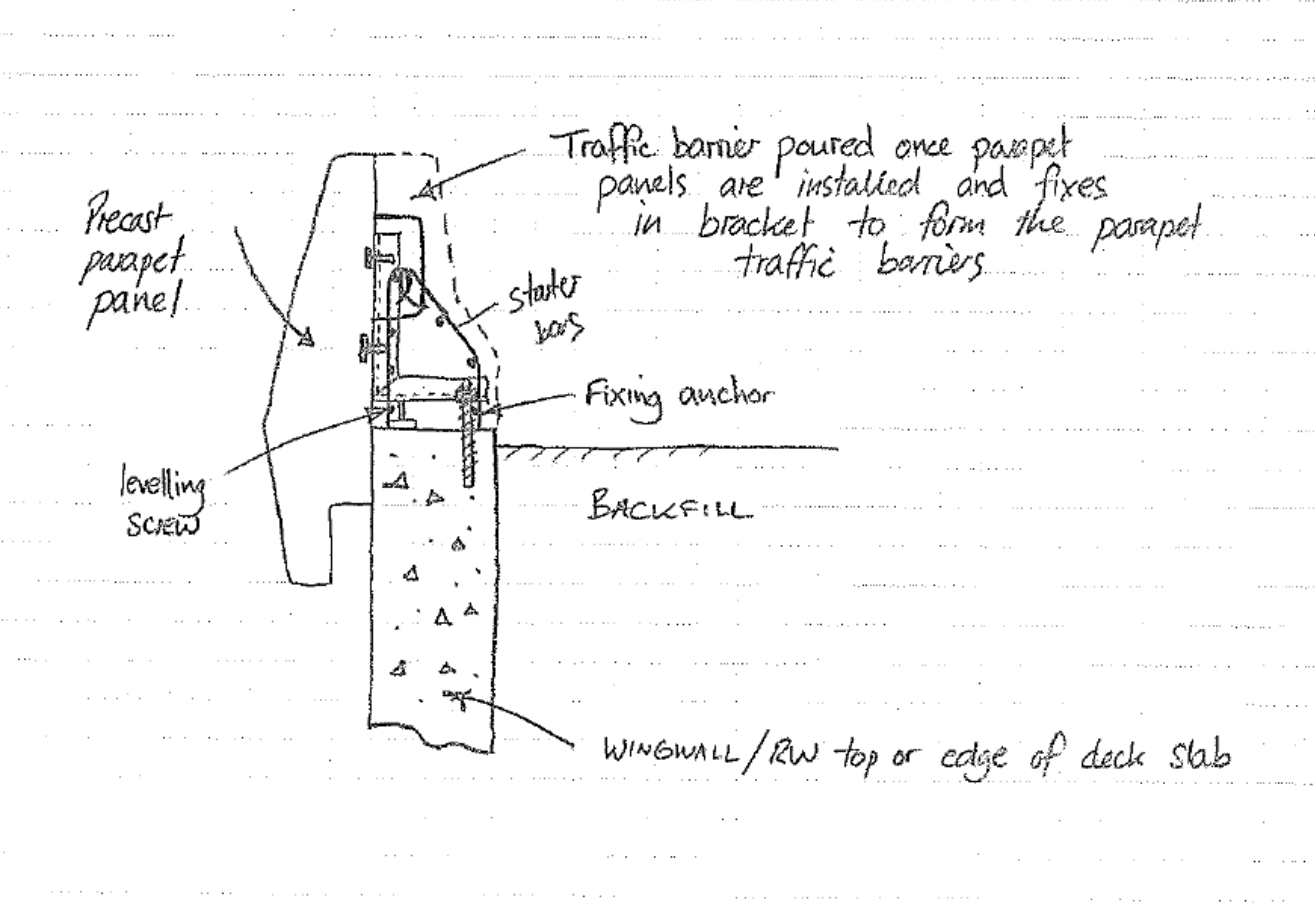 Well, slight rant over I’ll get back to the bridge. At present we are about 4 days ahead of programme with a key activity coming up which is installing the parapets. In reality we should be able to install the 24 panels at a rate of 6 a day but that is only if we get the prep work right. Each panel weighs 3T and is held in place by three L shape brackets that fix onto the deck/wingwalls/retaining walls. The fixing anchor as you can see from the diagram has been cast into the appropriate element and there is a levelling screw at the back edge that can be adjusted and sits on a steel plate that is epoxy glued on to the concrete. This has the potential to take a long time if the prep is not right as the tolerance is only mm between each panel. Once the panels are in the traffic barriers are formed over the bracket which tie in the panels and form the parapet barriers along the length of the bridge. On Eastwood Bridge we had one of these panels move out when we poured the barrier which gave us issues when we installed the metal traffic railings and throw screens which sit on top. I think this was due to the anchor fixing slipping as the bolt sits through a slotted hole and I think the additional force generated from wet concrete caused the bracket to slip which tilted the panel outwards as opposed to the bracket actually failing. To remedy this I intend to weld all the nuts and reinforce the brackets with straight bar diagonals welded on once all the panels are installed and we are ready to pour the barriers.