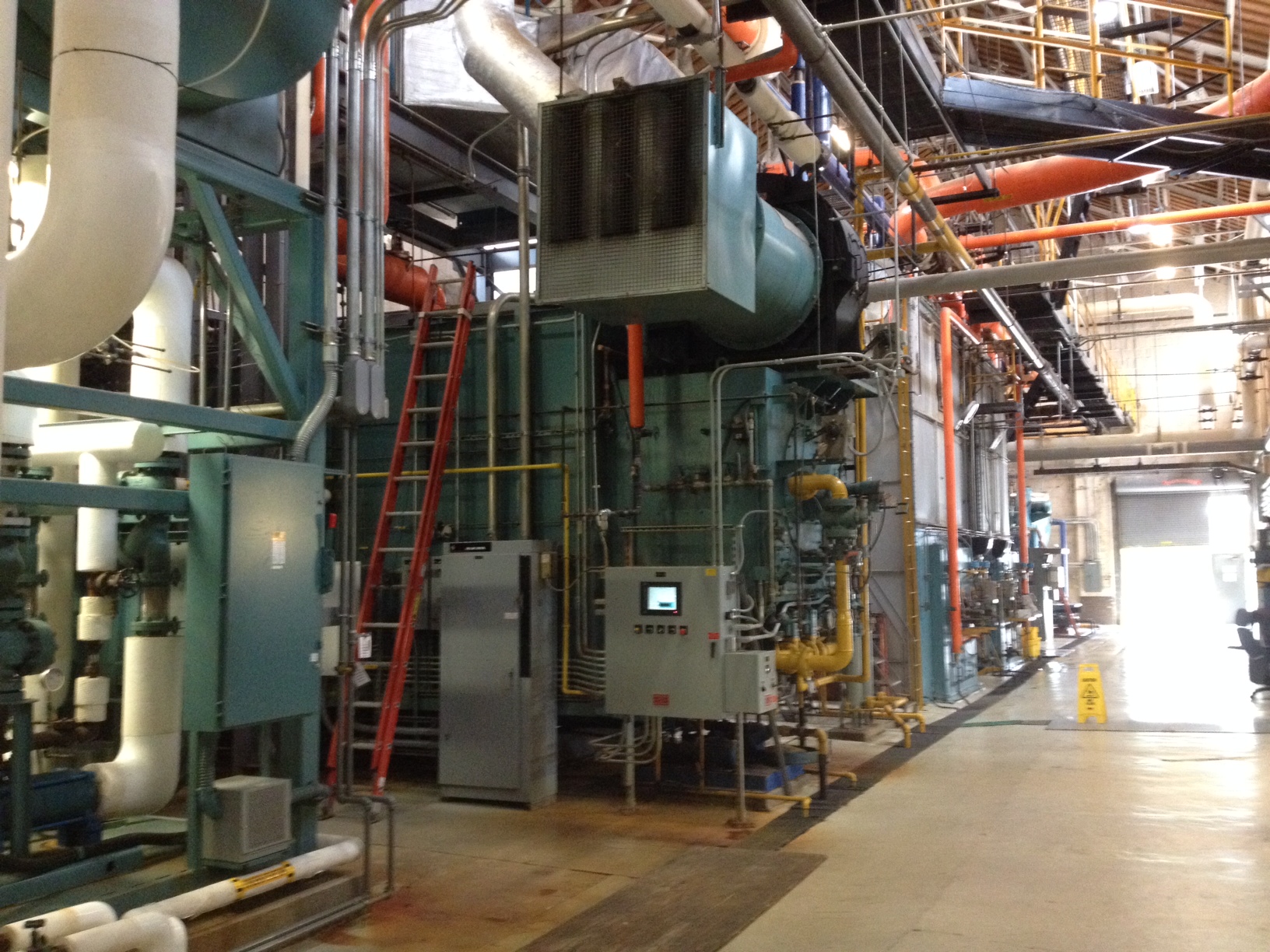 I also visited the steam generation plant on site to see how it compared to our boiler setup. This is pretty big facility providing steam for all other buildings on site. Our interest comes form the fact that the plant has a continuous analysis system that checks the water quality constantly and can notify the engineer by phone or wifi if an issue occurs that the machine cannot sort or even order more chemicals. The equipment is all provided free by the vendor (although the installation isn’t) who set this up and enhance boiler lifetime considerably.