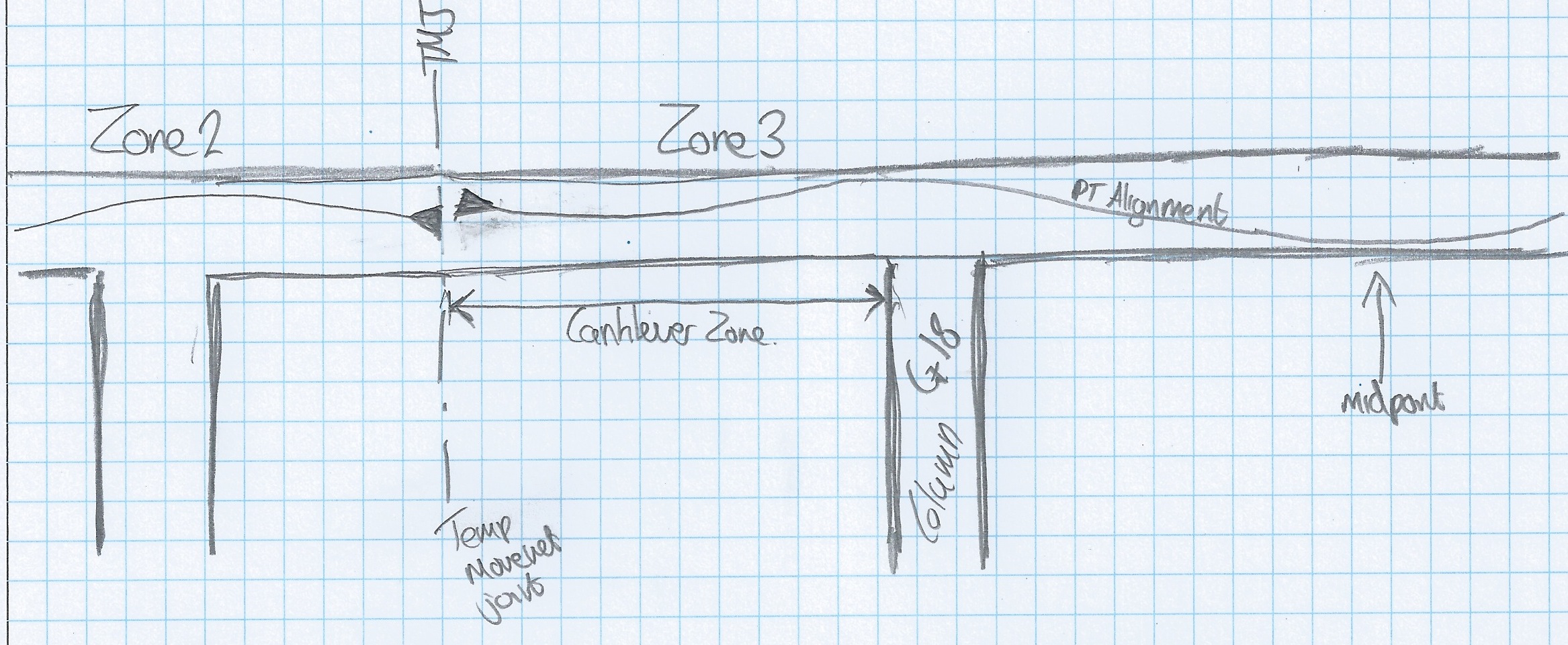 The current issue that I have found with Level 1 is that the structural design has not effectively checked the design of the reinforcement, cast ins, services or PT for clashes. It is causing many issues on site that are not helped by the individual subcontractors inability to liaise with each other. It is actually in their contract to liaise with other trades but none appear capable of doing so and resort to just complaining to any JHG employee who is available. It really is very petty. The issue shown in Fig 5 however is purely the structural engineers issue of not deconflicting PT and reinforcement. The issue is not in the alignment of the ducts or placement of the anchors but in allowing in the design of the reinforcement for the placement of the pans that allow the stressing of the cables to take place. As it stands the pans (400mm wide) do not fit side by side as designed between the vertical links, spaced at 600mm across the beam. My proposal was to stagger the PT ducts to allow them to fit between the links. This is only possible at this point at the PT is effectively being used to create a cantilever over a column to increase the capacity of the adjacent beam (See fig 6). It occurs to me that many of these issues could have been avoided by using a single BIM system and good communication.