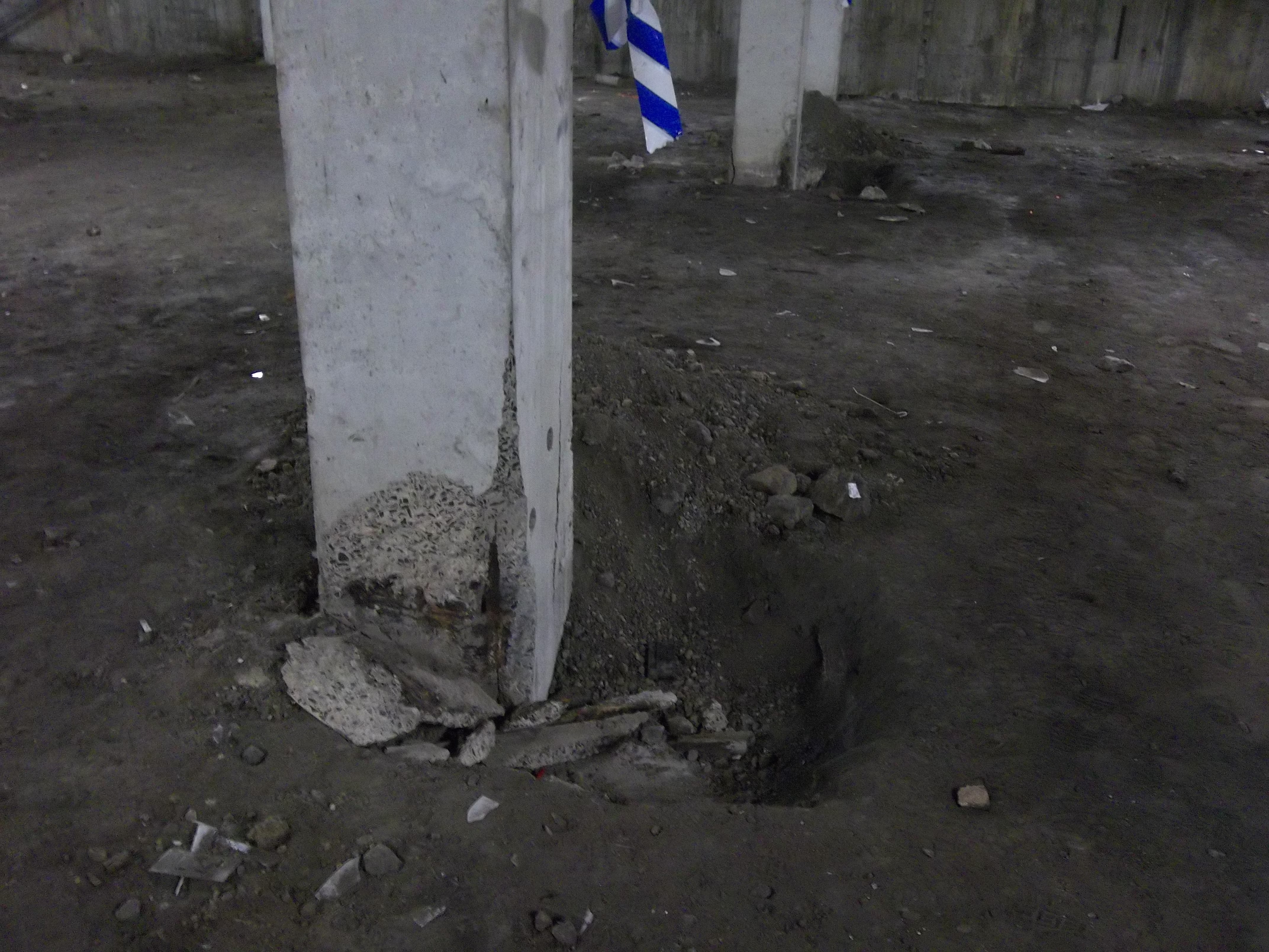 Initial thoughts were that stray current may be the cause of the corrosion. The tracks run parallel to the depot and it was proposed that the piles were picking up stray current from the tracks and conducting it to a point closer to the substation. However, the corrosion has only been observed above ground level and when the ground to the top of the pile cap was investigated there were no signs of corrosion. It must be pointed out as can been seen from the photos that the area of concern is approximately half the footprint of the building and there is no ground slab, the other half of the basement is in good condition (has a floor) and is used as an underground car park.