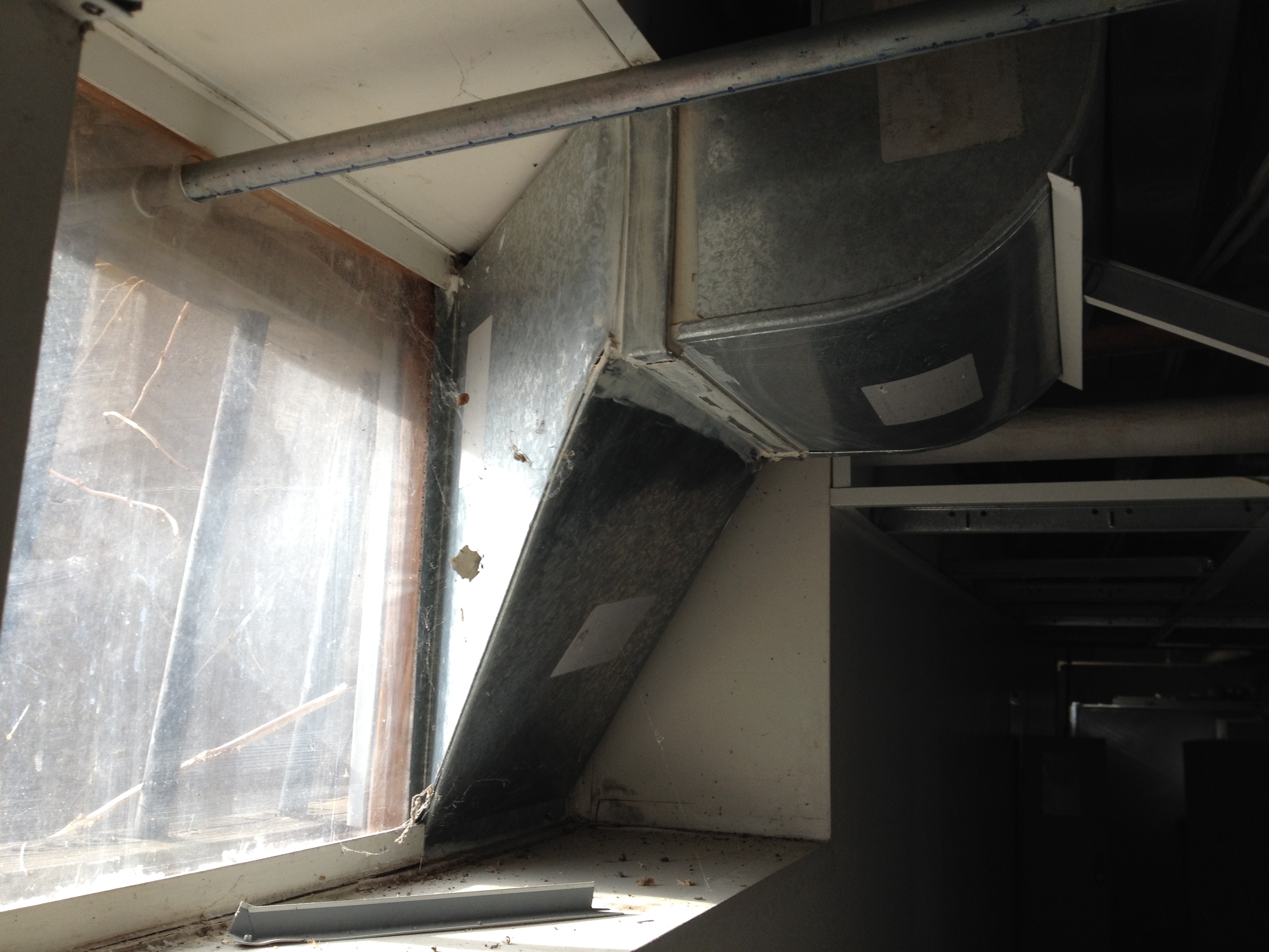I took the opportunity to visit my possible next project, Hale Hall. This former 1920’s barrack block was retro fitted with HVAC over the years before catching fire in 2006. Going round the building meant getting dressed in protective suits because of the presence of mould and bird poo. What was strange was that the fire damage was limited to the roof of one side but the whole building was water damaged and trashed. It was like walking through a time tunnel because the place simply had all the top secret stuff ripped out and was left. Not even desks had been cleared. Below are some of the odd HVAC designs I discovered.