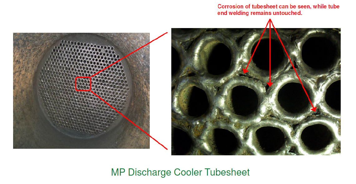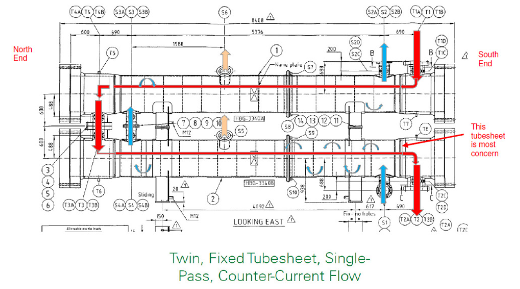 Given that the shell sees thousands of litres of hot sea water a day, and the designs allowed for an area of relatively undisturbed flow around the junction between some of the tubes and the tubesheet allowing carbonic acid to form, it was only ever a matter of time before corrosion ate through the HP/LP interface. This issue is a key driver for the installation of the HP cooler as the same fabricator and QA procedures were responsible for its commissioning. However the situation at the HP cooler is subtly different with the shell geometry being different, with far less undisturbed coolant flow and the tube side flow being effectively dry, so little or no risk of H2S drop out and corrosion on the tube side. While the failure of the HP cooler is fairly certain, the difficult question is what the time frame is. If it is less than 5 years, then there is a huge driver for this project to be complete in time for the 2015 Turn Around, a planned shut down of the asset. I am keeping a close handle on this issue, but there are a couple of other stakeholders who I am working closely with to ensure that this issue is brought home sooner rather than later.