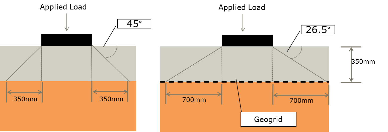 The Tensar solution provided calculations based upon a CBR value of 1% which they have equated [by an unknown method] to an undrained shear strength of 24 kN/m2. The design utilises the TriAx geogrid and asserts that the load distribution will double as a result (Figure 5.1).