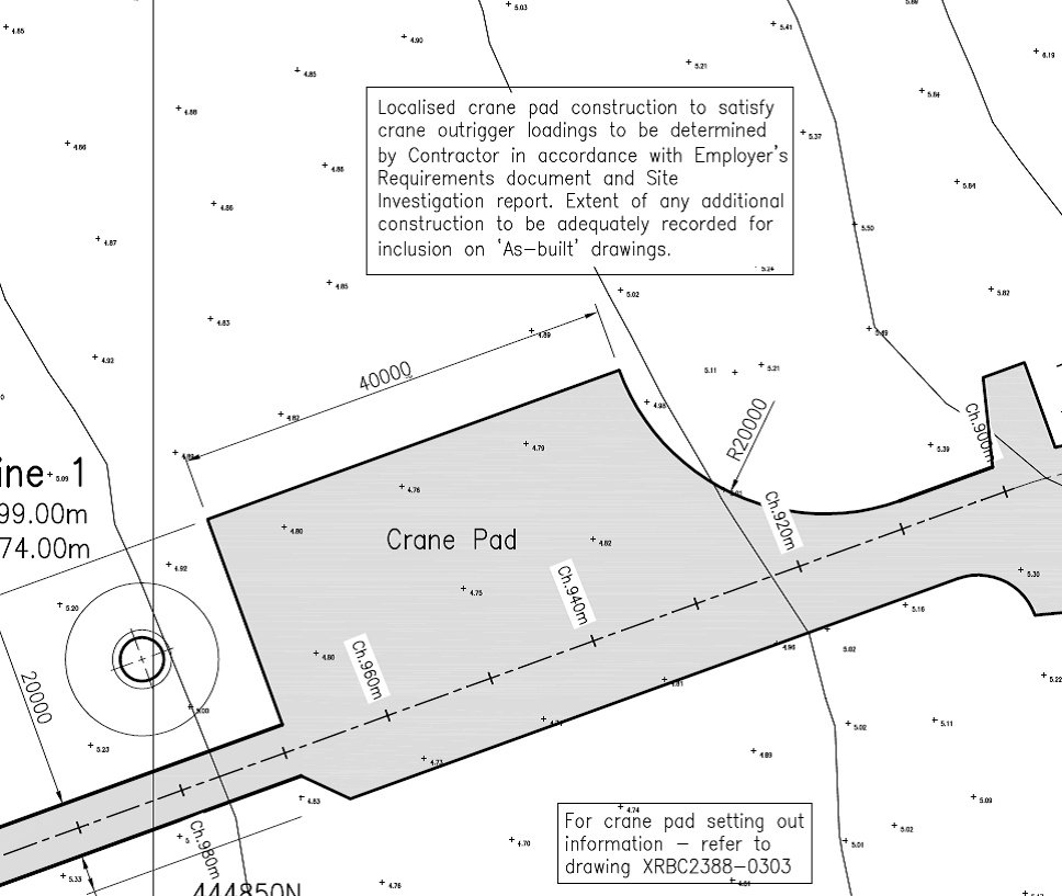 This document stipulates the minimum bearing capacity of the crane pad must be 200 kN/m2 unfactored. It also states that ‘floating’ designs are unlikely to be acceptable. The document continues to establish the minimum physical dimensions of the crane pads.