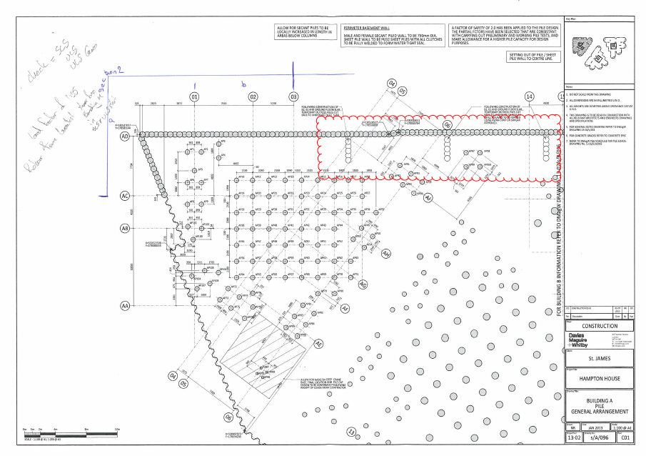 The pile design was completed by Skanska, for 3 x 30 story buildings. The buildings were sandwiched between the River Thames and a 4 track main route into Waterloo.