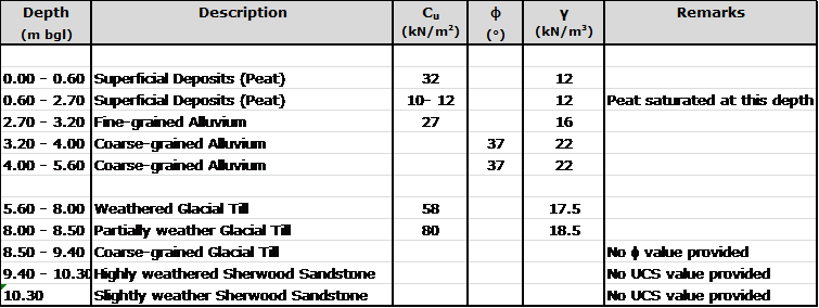 The assessed soil design parameters combined with the qualitative assessment of GI (Wales) indicate the presence of a slightly stronger ‘crust’ in the top layer of the Peat above the saturated zone. The material below the crust is significantly weaker and unpredictable, a foundation design might be suitable for the upper layer but the pressures applied to the strata below might exceed the allowable bearing capacity.