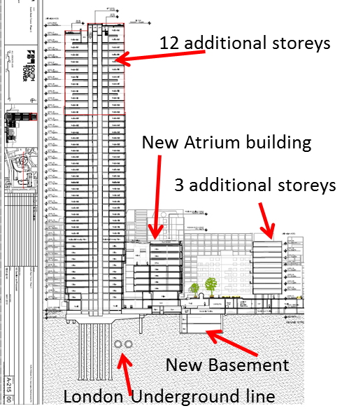 Works include a 12 storey extension on the existing brutalist designed 30 storey reinforced concrete tower block built in the 1970s by John Laing Construction Limited. This will be mixed office and residential space. Apartments start from £900,00 for 1 bedroom. The podium building (with commercial space) at the base of the Tower will have a 3 storey extension. There is a new basement, as well as a link span between the podium and the Tower.