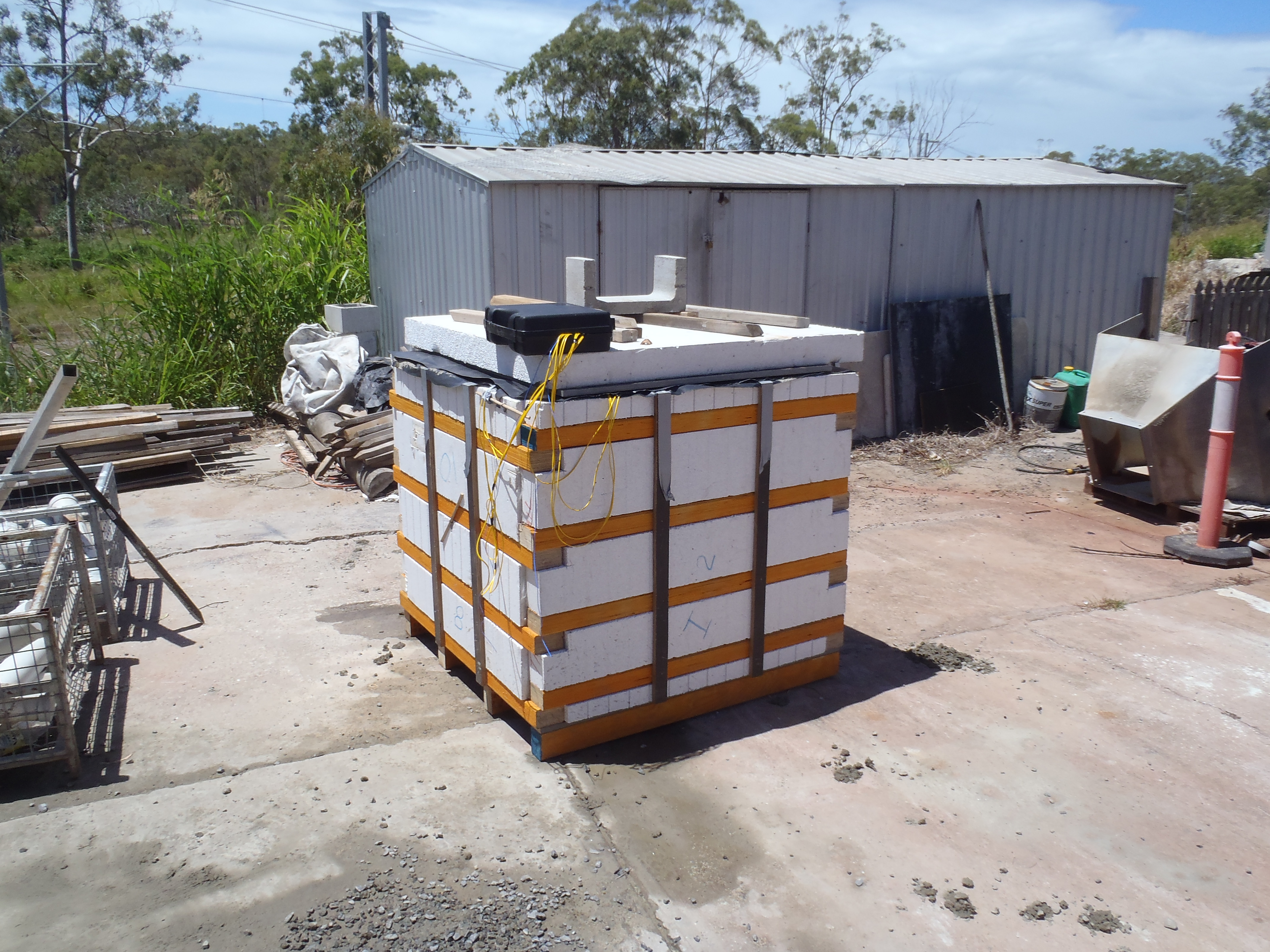 The thermal monitoring of the first concrete block (see pic below) was completed – max temp from all thermocouples was 69oC, a whole 5oC under the maximum allowable. This bodes well, as the placement temp was right on the limit (anything over 25oC will be rejected). However Hanson made such a hash of getting the mix right on the day, with the first slump being 200mm instead of 100mm – prompting a change in the mix design (which had already been submitted to the client) After their lack of interest at this and poor attitude from some of the management I’ve now got a thermal trial going with Holcim. It looks like Hanson might have just lost out on a few million dollars worth of work!