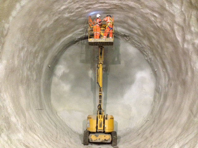 A flat bed lorry carrying a hose arragement designed to attach to a spray concrete delivery system, applying upto 20m3/hr of concrete to the walls. Much the same as a system that already exists on site, uniquely it is has an on board automated survey system allowing it to scan a the profile of the tunnel, then apply material to a consistent thickness. Manufactured by MeyCo in Switzerland there are only 5 operational units in the world. BASF purchased one, and are seeking to procure a second. (This is important later.)