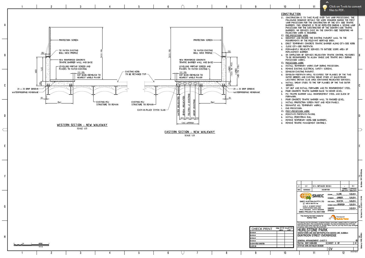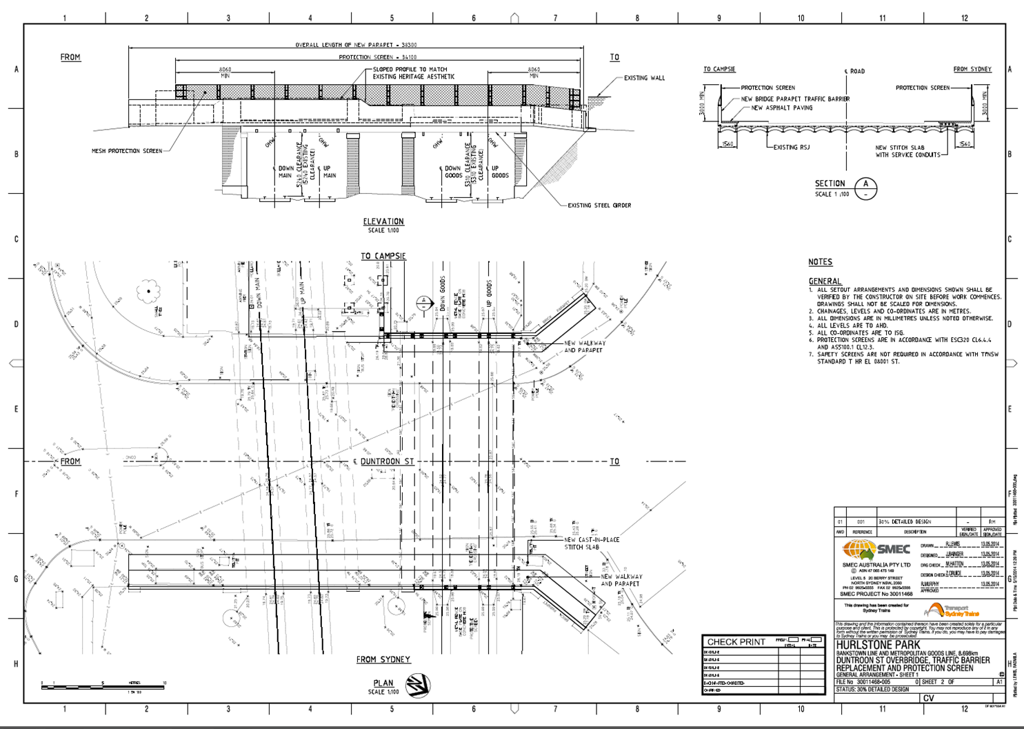 I seem to be the popular choice at the moment to compile and submit tenders, which doesn’t seem to be affected by the fact I have not won any yet because I have just received another one (no doubt my last) while also currently managing three design projects. Over this attachment I have been involved in nine projects (6 tenders and 3 design/PM). The one I have been working on intermittently over the last few months is the detailed design of a traffic barrier to replace an existing masonry parapet in order to comply with current standards. I have subsequently designed a cast in-situ barrier to be constructed on the outside of a 100 year old ‘jack arch’ rail overbridge. I have also modelled the bridge using Microstran to see if the existing structure can accommodate the traffic impact loads. A traffic assessment at the concept stage identified that an intermediate traffic barrier performance was required which stipulates an outward horizontal load of 180kN at 1.1m above road/footpath level, as well as a longitudinal load (to be applied simultaneously) and a vertical load (to be applied as a separate load case). The Australian Standard AS5100 (Bridges) does not explicitly provide a detailed analysis procedure for bridge barriers. As a result, current practice uses American Association of State Highway and Transportation Officials (AASHTO) design procedure based on yield line analysis. The design deliverables for the project are; Concept, 30% detailed, 70%, 100%, IFC. I have just finished getting the 30% DD drawings together to submit to the client (Sydney Trains) by the end of this week in a hope to have the 70% design complete and submitted by the time I leave. I have had to commission a Statement of Heritage Impact (SoHI) and I am now in the process of getting the environment team to produce a draft Review of Environmental Factors (REF) that may be affected by construction such as dust, noise, heritage, social and economic impact to the area. Because it is an overbridge that spans over two rail lines the work will impact rail services during two planned 48hr possessions as well as closing one lane and possible both to vehicle traffic during construction. The amount of work and consideration involved for all aspects of the project all stems from successfully identifying the stakeholders at the very start and you soon realise how many people, organisations and authorities are involved in successfully implementing a project. Below are the drawings at 30% design not showing reinforcement.