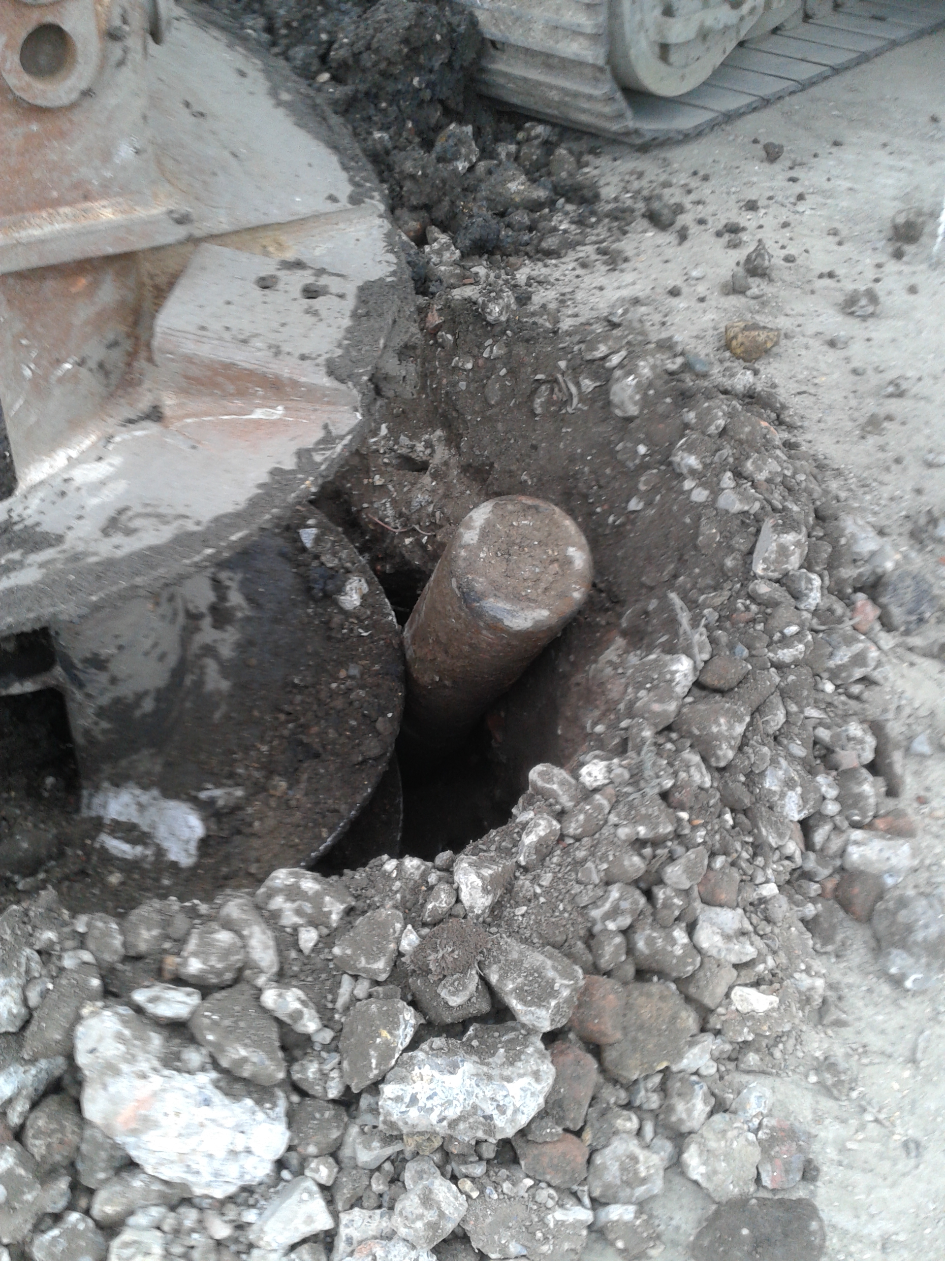 It was around 150mm diameter all the way down with no tail fins or pointy ends so I was 90% sure it wasn’t going to start ticking at us. I took some photos to brief the services and then cleared my area of responsibility of operatives. As the site was getting evacuated I found the piling rig operators and used the search advisor questioning technique to find out what they were doing when they found it and what actually happened. The rig was drilling the pre-bore for the casing when it hit a metal obstruction about 1.5m BGL. On moving the auger forwards and up, it uncovered the metal object that started hissing. At that point the rig crew stopped work and promptly left the area to raise the concern. We got the site evacuated and after around 45 minutes 4 police cars turned up.