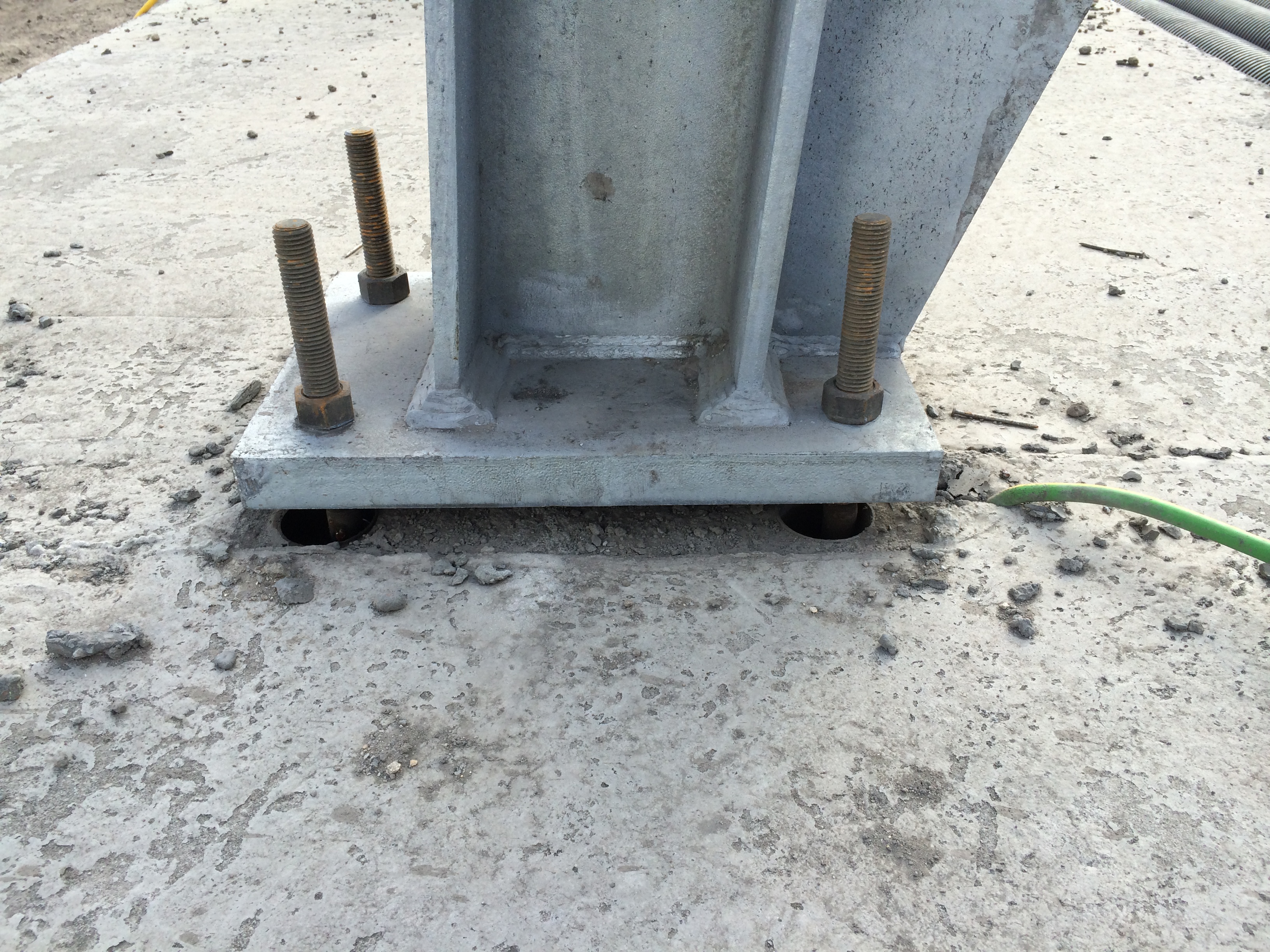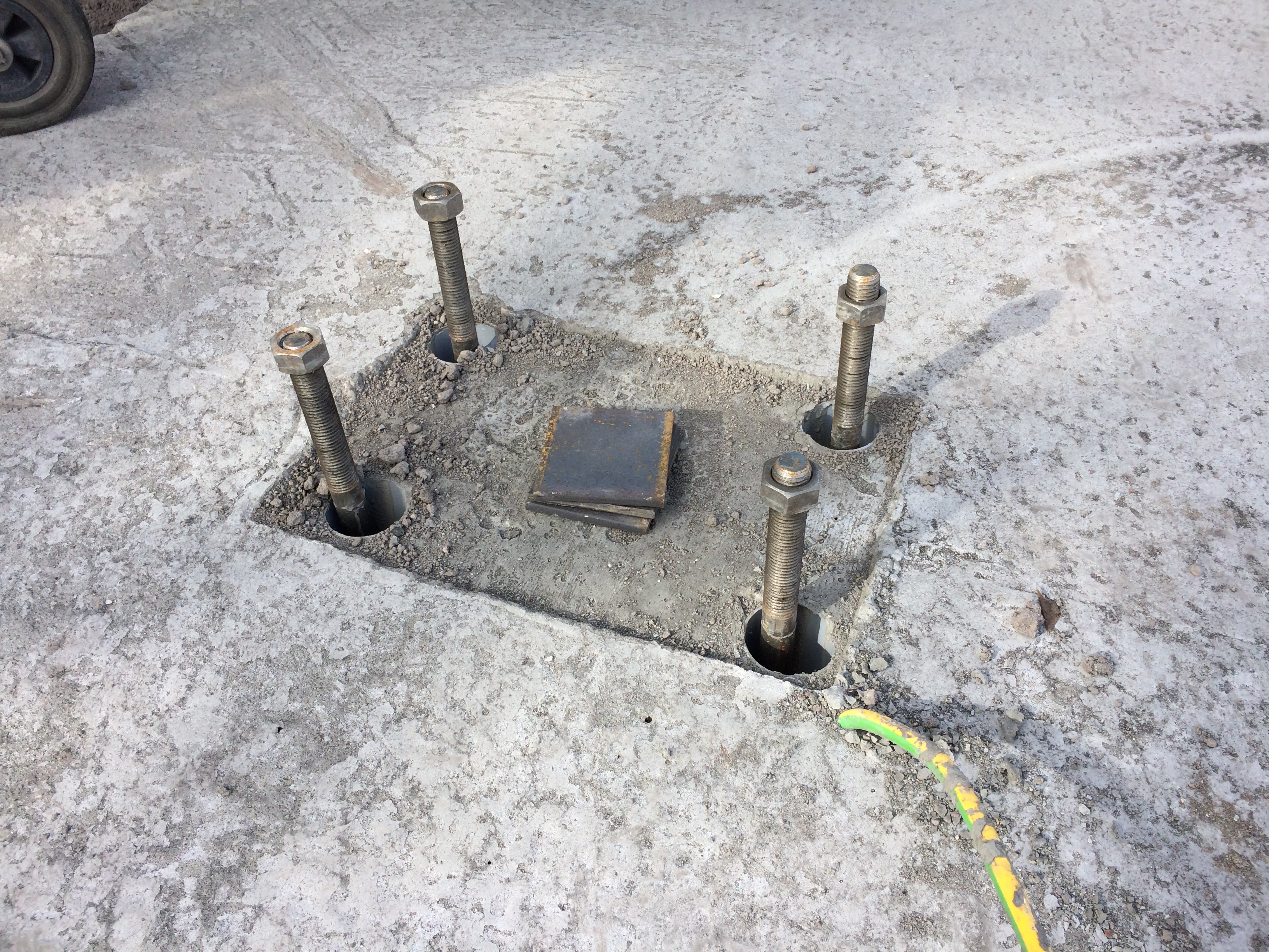 The bolt pads are made in advance and fixed into plywood templates that match the column base plate exactly. The bolts are placed into 60mm drain pipe cut to length acting as a void former to allow some horizontal movement for ease of placement and take out any setting out error. The trestle foundations were designed for compression and tension (predominately due to the wind loading on the high structures) and as such additional steel right angle plates were fixed to the ends of the bolts to increase the resistance to the tensile force. The design and finished in-place bolt pad (template removed) can be seen below.