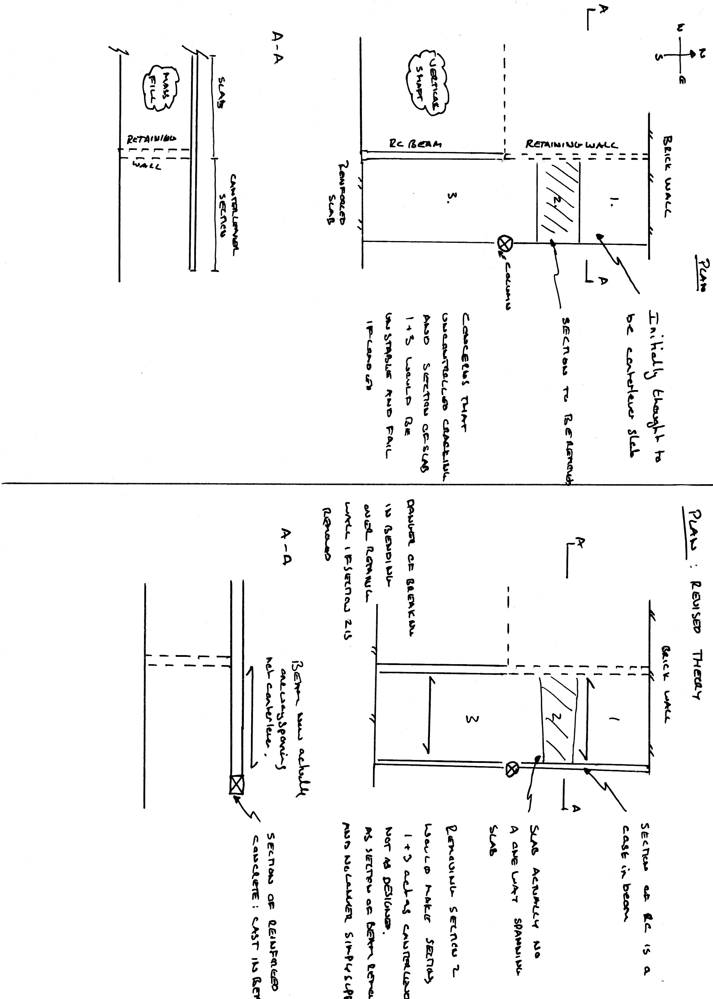 The area of slab to be removed as a 1.5 x 1.5m section. The section of slab appears to be cantilevered over a small retaining wall with the canter lever wall reaching west to east. The area that appeared to be canter levered is tied into a brick wall at the northern end and then merely sits on top of the connecting flange of a cast iron column at mid-section and then tied into a reinforced concrete slab at the southern end. Between the Column and the northern wall there is only one small supporting strut. Between the column and the southern end the small retaining wall ceases and a vertical shaft opens beneath the slab. My concern was/is that the breaking out of the section would/could result in unpredictable cracking and the failure of the slab presenting a risk of injury or death if loaded. A phone call to the rear guard for some further advice deduced the following: