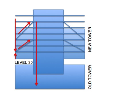 The South Bank Tower extension from 30 to 42 storeys is based upon the requirement that all vertical loads must be transmitted down the existing core to the foundations.