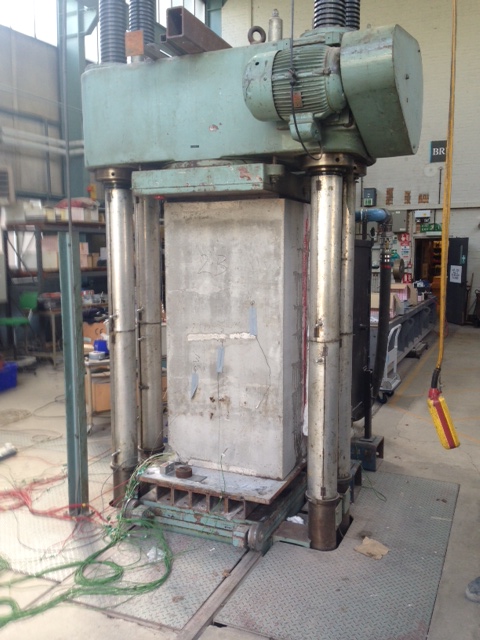 - Specimen is placed in test rig (500 tonne compression machine) and loaded to an applied axial stress of 5MPa, in order to replicate the hoop stress seen in the tunnel lining.