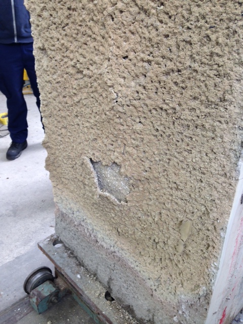 In the event no spalling was witness during the test, with the exception of the 3rd test. Here, the spalling was restricted to a localised area towards the bottom half of the test panel. This occured relatively early in the test (18mins). This caused some consternation, but on inspection the spalled area was less than 25mm thick, so in fact the regulating layer had performed its function: as a sacrificial layer. No damage was recorded to the secondary lining.
