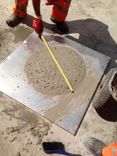 A slump/flow test is conducted in accordance with BS EN 12350-2. A critical feature of the self compacting mix in this instance is the workability. The location in the works dictates that the concrete pour would be difficult/unsafe to effectively vibrate into position, and thus a flow to allow movement into these areas is an imperative.
