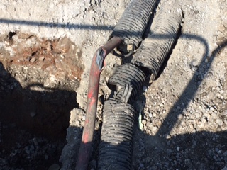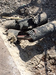 The first photo shows the primary 11kV line that we hit and the fibre optic cables that ran in parallel. There happened to be a secondary HV line directly underneath the primary that subsequently proved useful. By the skin of our teeth only the armour surround to the cable had been pierced not the inner cable and it never went bang despite being wrenched a few inches up by the excavator bucket.