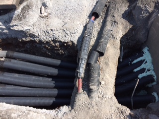 How to fix HV lines! The armour was cut away and replaced followed by a mould that was pumped full of resin to reinstate the outer casing. This was then re-sleeved with the ducting. We also used the 12 hour period to complete the undermining of the lines and fit our 12 ducts into the manhole as can all be seen in the photographs below.