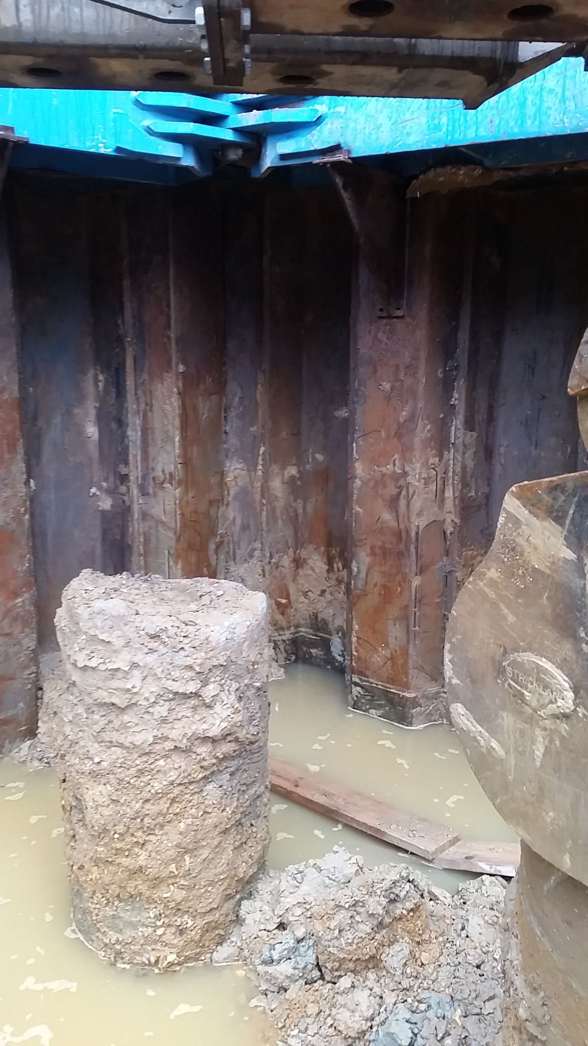 The excavators had retreated to the highest points they could but the water had risen nearly 1.5m and was now lapping around their tracks. The office then became much more excited and frantic emails were being sent backwards and forwards between the construction manager and the temporary works department. The de-watering well can be seen in the pictures as the blue vertical pipe and this was maintaining the water level but not draining it. They tried to pump the water out with 2 tankers but the high groundwater levels in the terrace gravels above the clay layer just kept coming in. They then noticed another problem hiding behind the sheet piles:
