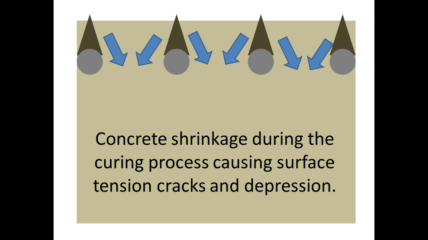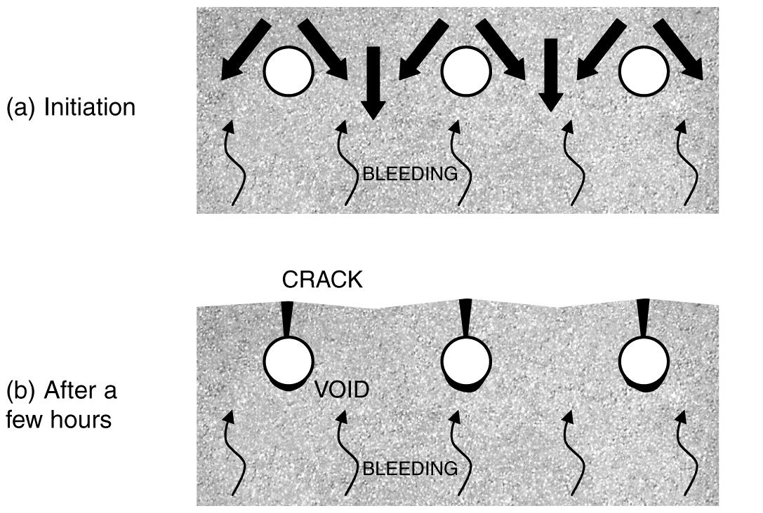 This suggests that the cracks could be caused when the settlement of fresh concrete is restrained by the reinforcement. Plastic settlement cracks can form in young concrete, within the first few hours after placing. As water moves upward through the mixture, the denser constituents move downward accentuated by any over-vibration. This downward movement may be obstructed by the top layer of reinforcement.