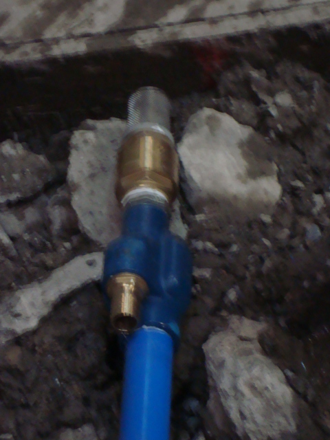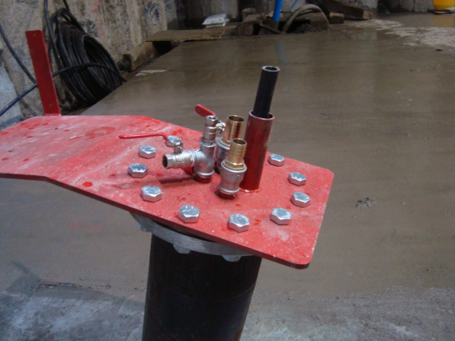 Pictures Right to Left, Well head showoing water inlet and outlet, ejector pump head, water injected through left connection, water removed from main blue pipe.