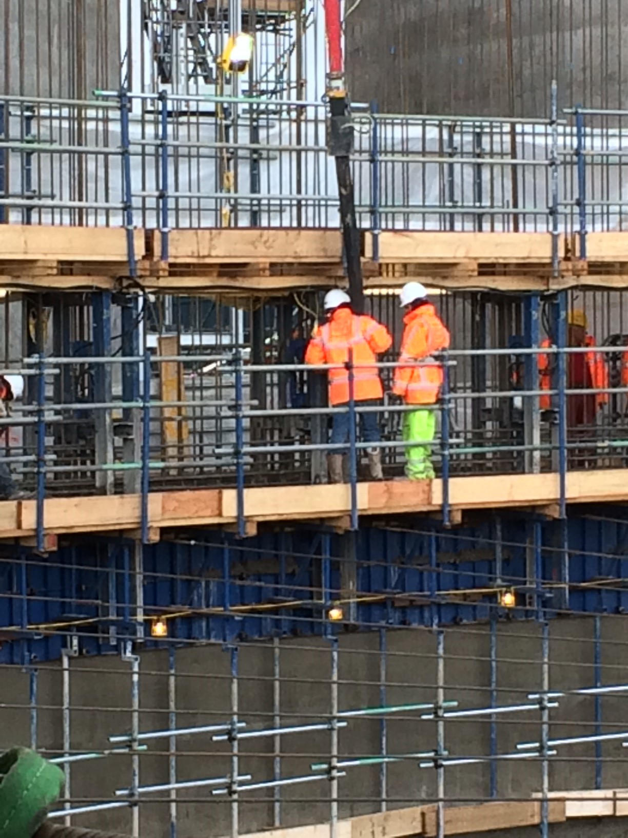 The slipforming platforms are on 3 levels. The upper level is used for the placing of the 20mm vertical steel bars (that are at 3 different heights, meaning only a third need changing at the same time) and the solid slip bars, that the jacks run up, that are placed inside the wall and cast insitu to be jacked out once complete. The middle level is the chaotic level (as Richard mentioned in his blog), where the concrete is pumped into the shuttering, the 25mm horizontal steel bars are placed and the actual slip is controlled. The shuttering is 1.2m deep. The lower level is used for rubbing down the concrete after the slip shuttering has moved upwards to create the specified finish. There are never less than 45 guys on the decks.