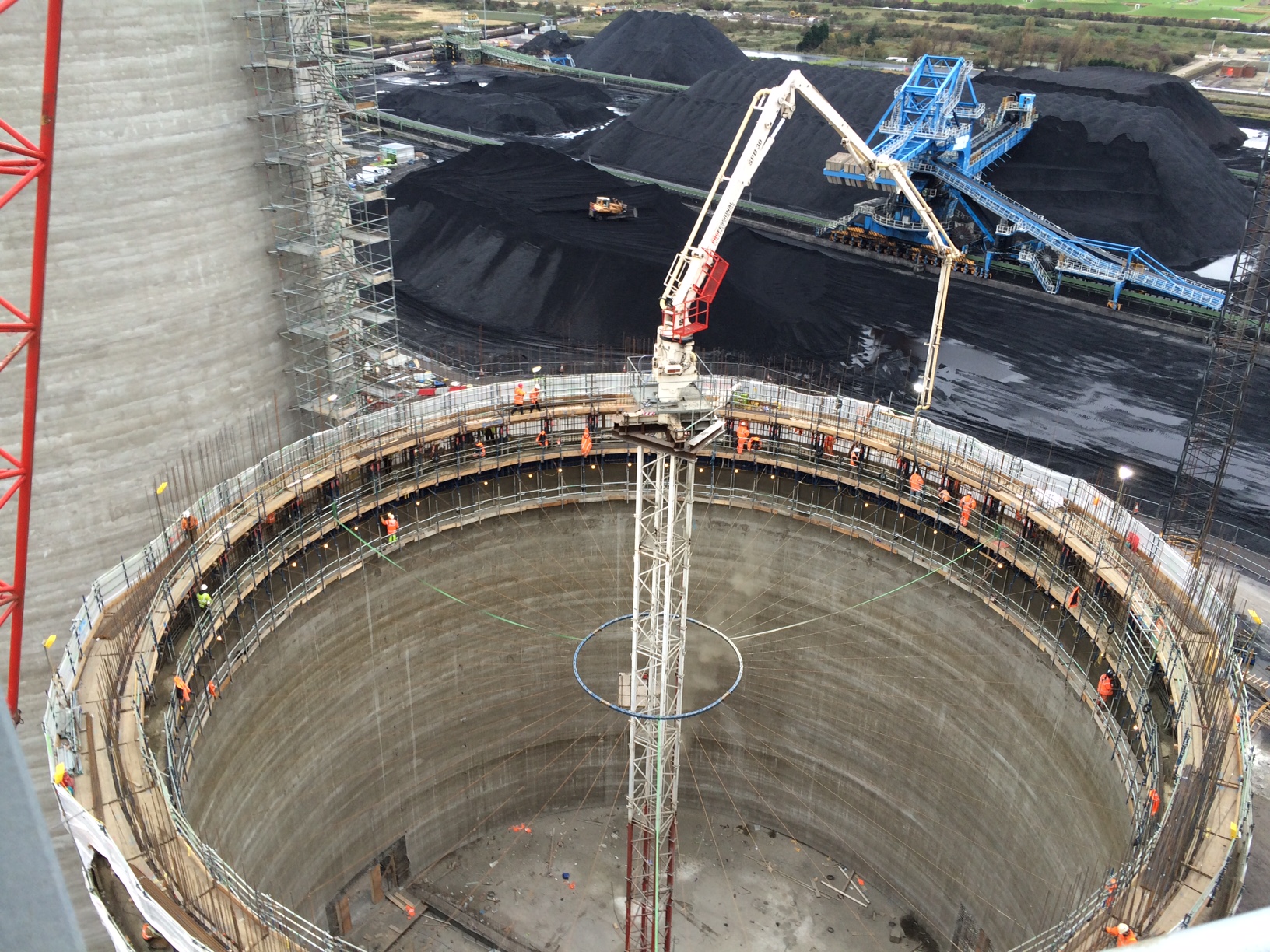 The silos range in height from 52.524m – 63.107m AOD and the actual slip height’s are 46.924m – 58.457m respectively. The internal diameters are 37.5m with a wall thickness of 450mm. Silo 6 (50.424m slip height, 2705m3 of concrete) was the first to be completed and it took a remarkable 168hrs almost exactly from approx. 0700hrs on Mon 29 Sep through to 0700hrs Mon 06 Oct, 3 days ahead of the programmed 10 days. That’s an average of 300mm an hour or 16.095m3 of pumped concrete an hour, only 12x slower than the common snail at 83micro m/s. The teams are currently running in 2 x 12hr shifts maintaining a 24hr continuous pour, 7 days a week. It is reputedly, the largest continuous pour conducted in the country this year. There are 2 sets of slipform equipment so within 30mins of completing silo 6, silo 5 was started. This will be repeated for silos 7 and 8 and should therefore be completed in 40 days and 40 nights of continuous concrete until over 10000m3 has been poured.