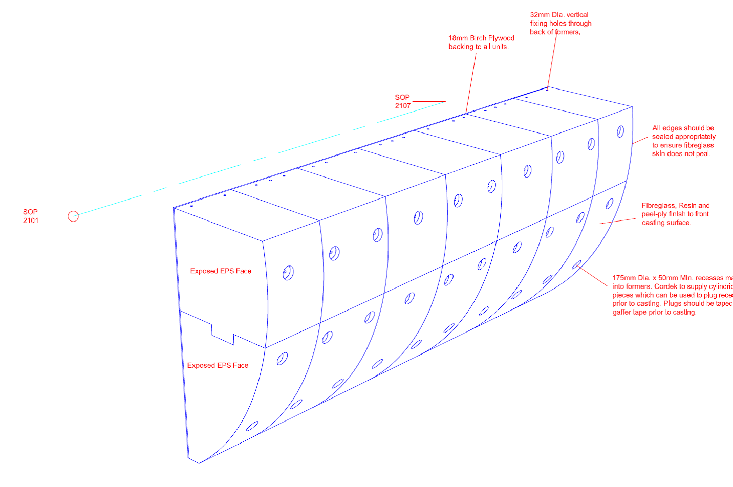 The internal profile, defined here by the bold line, designates the secondary lining, which is all cast in situ. Design. The front face of this section details a relatively large span at approximately 12.6m. This would be considered challenging to complete entirely in sprayed concrete. But the ‘figure of 8’ design creates high stress zones at the confluence of the two tunnels. This requires support which is designed in the form of the ‘binocular wall’ shown as the upright in blue. You will note that in comparision to the remainder of the secondary lining, the wall itself has large proportions. This design copes with the temporary state during the excavation of the second tunnel and prior to ring closure. Sidewall Issues. Aside from the day to day frictions that I will not cover here the casting of the invert, headwall and binocular wall sections passed largely without incident. However, the right hand sidewall was poured in my absence, with some issues. The profile of the sidewall is formed by the use of bespoke poystyrene void formers, which are designed and laser cut by a specialist contractor. They are supported by RMD Kwikiform temporary works, again designed by sub contractor. Despite being contracted out, temporary works repsonsibility falls to us, so I got involved here to check design calcs, and made some adjustments for buildability purposes. Designs are shown below