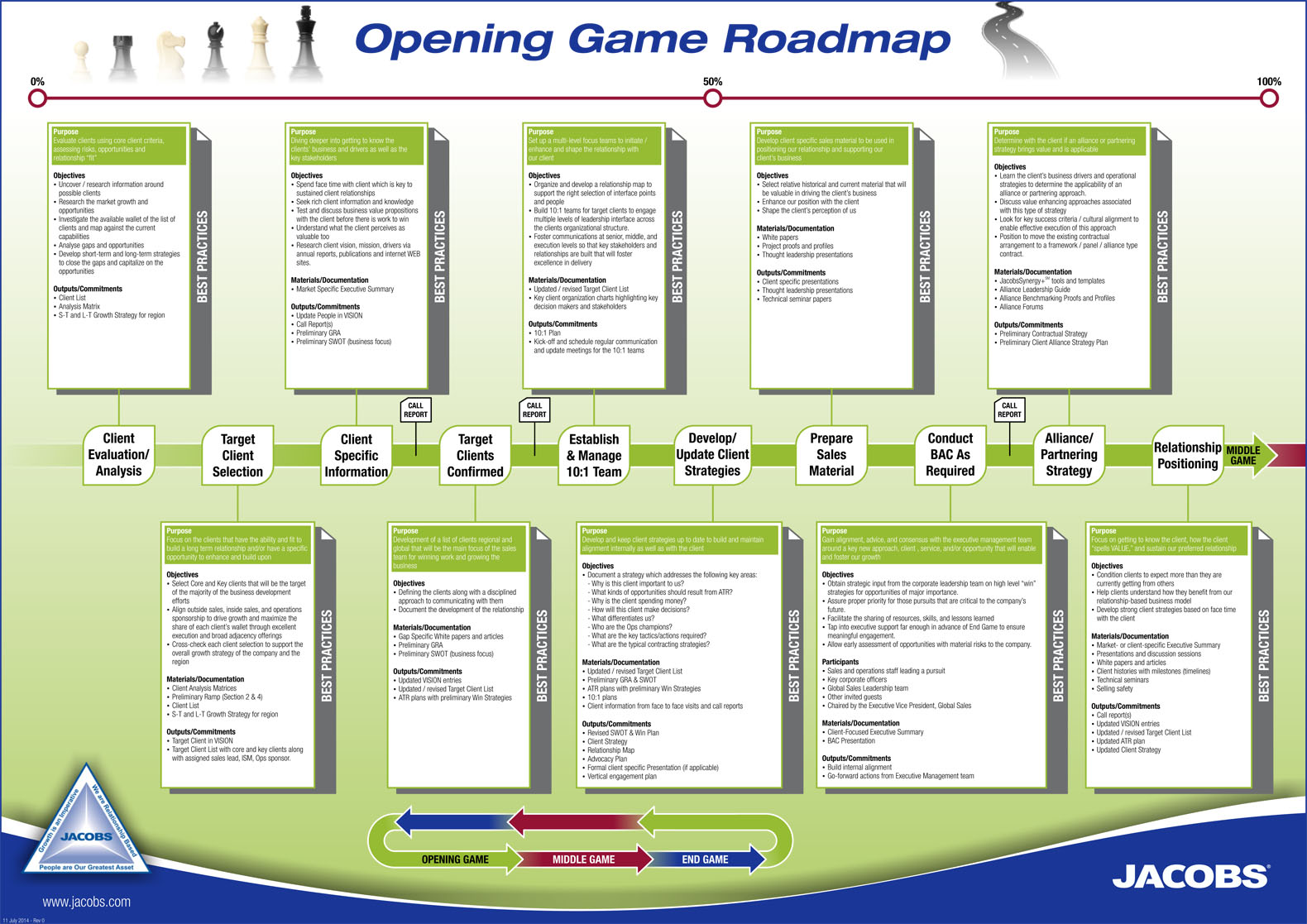 The company separates the early stages of winning work into three parts: the opening, middle and end game. To put this in context of a project timeline, the tender decision is the last part of the end game. There are some flowcharts to guide people through this process (see below – handy for new people like me). The middle game decides the go/no go in pursuing the work from the client. Prior to this a SWOT analysis will have been completed on the Jacobs bid, but also one that looks at the competition.