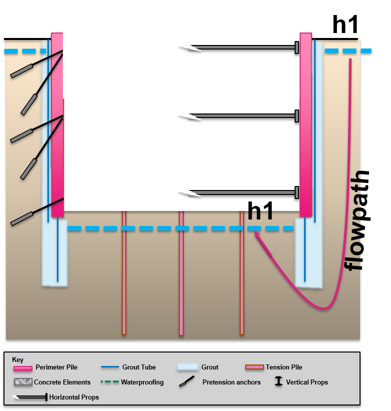 Ground water cut off increase the flow path. In order to reduce the flow of the water a vertical cut off may be used to reach a lower permeable soil boundary or to increase the length of a vertical cut off to increase the length of the flow path and reduce flow. A typical method for achieving this is the use of piles either sheet or RC concrete. The geotechnical team within Arup have opted to used injection grouting at the base of the pile to create vertical cut of. In this case a TMS (Tube a Machete, read tube with holes in it) is inserted through the pile and grout injected in to the soil to fill the voids. The intention is to us a course grain grout followed by a finer grain grout to create the vertical cut off and reduce the dependency on augured piles.