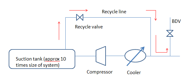 For my HP discharge cooler project I inherited a HAZOP action of this nature and I have drawn a simplified schematic of the system in order to explain it. I am replacing the heat exchanger (or cooler) and the question was would the minimum temperature reached during a blow down damage the new cooler. Ultimately, this is an idiotic HAZOP action and I will explain why below. However, it has taken me a long time to realise this was stupid.